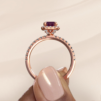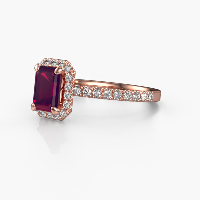 Der oben gezeigte Verlobungsring wird Miranda eme genannt. Es ist ein Halo Ring, da er einen zentralen Edelstein und ein Band mit Pavé-Fassung hat. Der 14 Karat Roségold ring ist mit einem 7x5 mm smaragd schliff Rhodolit-Mittelstein besetzt und um ihn herum eine Pavé-Fassung mit Diamanten. Was diesen klassische, Roségold Halo Ring besonders macht, sind die kleineren Steine, die den zentralen Stein umschließen. Dieser wunderschöne Verlobungsring wird als Halo Ring bezeichnet, da die kleineren Edelsteine dem zentralen Stein einen Lichthof geben. Damit die kleineren Steine den Mittelstein verstärken, müssen sie so platziert werden, dass keine Lichteinflüsse auftreten. Und hier kommen unsere erfahrenen Goldschmiede ins Spiel. Jeder einzelne Stein wird sorgfältig von Hand in den Ring gesetzt. Während der Herstellung wird der Lichteinfall ständig überprüft. So können wir sicherstellen, dass der spezielle Lichtkranz noch sichtbar ist. Am Ende erhalten Sie einen einzigartigen Verlobungsring mit einem Rhodolit Ihrer Wahl in der Mitte. Sie können sich die Wirkung eines solchen Ringes vorstellen, wenn Sie ihn an ihrem besonderen Tag für sie zum Leuchten bringen. Durch die Kombination modernster Technik mit uralter Handwerkskunst können wir alle Verlobungsringe in unserem eigenen Studio anfertigen. Jedes Schmuckstück wird auf Anfrage gefertigt. Das ist vorteilhaft, weil wir Ihnen dadurch einen Preis anbieten können, den Sie nirgendwo anders finden.Unsere Designer und Goldschmiede arbeiten jeden Tag zusammen und versuchen, neue Schmuckstücke zu kreieren. Vielleicht haben Sie irgendwo einen schönen, klassische Verlobungsring gefunden, nach dem Ihr einzigartiger Ring gestaltet werden kann. Setzen Sie sich mit uns in Verbindung. Wir machen Ihnen ein Angebot, basierend auf einem fairen Preis/Leistungsverhältnis, das Sie begeistern wird.Um es einfacher zu machen, bieten wir eine kostenlose 30-tägige Rücksendung.