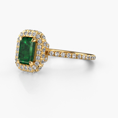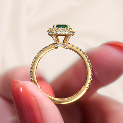 Der oben gezeigte Verlobungsring wird Talitha EME genannt. Es ist ein Halo Ring, da er einen zentralen Edelstein und ein Band mit Pavé-Fassung hat. Der 14 Karat Gold ring ist mit einem 7x5 mm smaragd schliff Smaragd-Mittelstein besetzt und um ihn herum eine Pavé-Fassung mit Lab grown Diamant. Was diesen Luxus, Gold Halo Ring besonders macht, sind die kleineren Steine, die den zentralen Stein umschließen. Dieser wunderschöne Verlobungsring wird als Halo Ring bezeichnet, da die kleineren Edelsteine dem zentralen Stein einen Lichthof geben. Damit die kleineren Steine den Mittelstein verstärken, müssen sie so platziert werden, dass keine Lichteinflüsse auftreten. Und hier kommen unsere erfahrenen Goldschmiede ins Spiel. Jeder einzelne Stein wird sorgfältig von Hand in den Ring gesetzt. Während der Herstellung wird der Lichteinfall ständig überprüft. So können wir sicherstellen, dass der spezielle Lichtkranz noch sichtbar ist. Am Ende erhalten Sie einen einzigartigen Verlobungsring mit einem Smaragd Ihrer Wahl in der Mitte. Sie können sich die Wirkung eines solchen Ringes vorstellen, wenn Sie ihn an ihrem besonderen Tag für sie zum Leuchten bringen. Mit unserer modernen Technik können wir Schmuckstücke von höchster Qualität mit größter Sorgfalt für Sie entwerfen und anpassen. Unsere Verlobungsringe sind immer um 30 Prozent günstiger als bei anderen Juwelieren. Wir fertigen Verlobungsringe auf Bestellung, also müssen wir keine großen Lager unterhalten. Wenn Sie ein bestimmtes Budget haben, beraten wir Sie gerne entsprechend.Unser Team fügt unserer Online-Kollektion täglich neue Designs hinzu. Unsere Designer und Goldschmiede arbeiten zusammen, um das beste Design zu kreieren. Wir bemühen uns, eine vielfältige Kollektion von Schmuckstücken anzubieten. Vielleicht haben Sie ein bestimmtes Design im Sinn. Eines, dass Sie irgendwo gesehen haben. Gerne geben wir Ihnen eine kostenlose Beratung. Wir machen Ihnen ein Angebot, basierend auf einem fairen Preis/Leistungsverhältnis, das Sie verblüffen wird.Um es einfacher zu machen, bieten wir eine kostenlose 30-tägige Rücksendung.