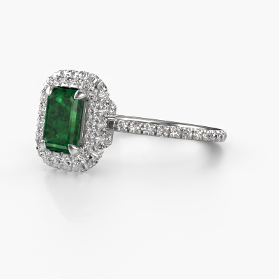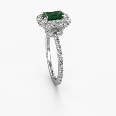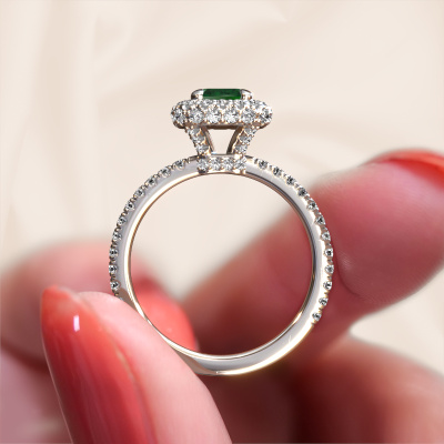 Der oben gezeigte Verlobungsring wird Talitha EME genannt. Es ist ein Halo Ring, da er einen zentralen Edelstein und ein Band mit Pavé-Fassung hat. Der Platin ring ist mit einem 7x5 mm smaragd schliff Smaragd-Mittelstein besetzt und um ihn herum eine Pavé-Fassung mit Lab grown Diamant. Was diesen Luxus, Platin Halo Ring besonders macht, sind die kleineren Steine, die den zentralen Stein umschließen. Dieser wunderschöne Verlobungsring wird als Halo Ring bezeichnet, da die kleineren Edelsteine dem zentralen Stein einen Lichthof geben. Damit die kleineren Steine den Mittelstein verstärken, müssen sie so platziert werden, dass keine Lichteinflüsse auftreten. Und hier kommen unsere erfahrenen Goldschmiede ins Spiel. Jeder einzelne Stein wird sorgfältig von Hand in den Ring gesetzt. Während der Herstellung wird der Lichteinfall ständig überprüft. So können wir sicherstellen, dass der spezielle Lichtkranz noch sichtbar ist. Am Ende erhalten Sie einen einzigartigen Verlobungsring mit einem Smaragd Ihrer Wahl in der Mitte. Sie können sich die Wirkung eines solchen Ringes vorstellen, wenn Sie ihn an ihrem besonderen Tag für sie zum Leuchten bringen. Mit unserer modernen Technik können wir Schmuckstücke von höchster Qualität mit größter Sorgfalt für Sie entwerfen und anpassen. Unsere Verlobungsringe sind immer um 30 Prozent günstiger als bei anderen Juwelieren. Wir fertigen Verlobungsringe auf Bestellung, also müssen wir keine großen Lager unterhalten. Wenn Sie ein bestimmtes Budget haben, beraten wir Sie gerne entsprechend.Unser Team fügt unserer Online-Kollektion täglich neue Designs hinzu. Unsere Designer und Goldschmiede arbeiten zusammen, um das beste Design zu kreieren. Wir bemühen uns, eine vielfältige Kollektion von Schmuckstücken anzubieten. Vielleicht haben Sie ein bestimmtes Design im Sinn. Eines, dass Sie irgendwo gesehen haben. Gerne geben wir Ihnen eine kostenlose Beratung. Wir machen Ihnen ein Angebot, basierend auf einem fairen Preis/Leistungsverhältnis, das Sie verblüffen wird.Um es einfacher zu machen, bieten wir eine kostenlose 30-tägige Rücksendung.