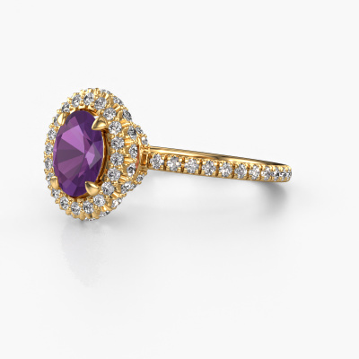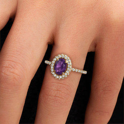 Der oben gezeigte Verlobungsring wird Talitha OVL genannt. Es ist ein Halo Ring, da er einen zentralen Edelstein und ein Band mit Pavé-Fassung hat. Der 14 Karat Gold ring ist mit einem 7x5 mm oval Amethyst-Mittelstein besetzt und um ihn herum eine Pavé-Fassung mit Lab grown Diamant. Was diesen klassische, Gold Halo Ring besonders macht, sind die kleineren Steine, die den zentralen Stein umschließen. Dieser wunderschöne Verlobungsring wird als Halo Ring bezeichnet, da die kleineren Edelsteine dem zentralen Stein einen Lichthof geben. Damit die kleineren Steine den Mittelstein verstärken, müssen sie so platziert werden, dass keine Lichteinflüsse auftreten. Und hier kommen unsere erfahrenen Goldschmiede ins Spiel. Jeder einzelne Stein wird sorgfältig von Hand in den Ring gesetzt. Während der Herstellung wird der Lichteinfall ständig überprüft. So können wir sicherstellen, dass der spezielle Lichtkranz noch sichtbar ist. Am Ende erhalten Sie einen einzigartigen Verlobungsring mit einem Amethysten Ihrer Wahl in der Mitte. Sie können sich die Wirkung eines solchen Ringes vorstellen, wenn Sie ihn an ihrem besonderen Tag für sie zum Leuchten bringen. Durch die Kombination modernster Technik mit uralter Handwerkskunst können wir alle Verlobungsringe in unserem eigenen Studio anfertigen. Jedes Schmuckstück wird auf Anfrage gefertigt. Das ist vorteilhaft, weil wir Ihnen dadurch einen Preis anbieten können, den Sie nirgendwo anders finden.Unsere Designer und Goldschmiede arbeiten jeden Tag zusammen und versuchen, neue Schmuckstücke zu kreieren. Vielleicht haben Sie irgendwo einen schönen, klassische Verlobungsring gefunden, nach dem Ihr einzigartiger Ring gestaltet werden kann. Setzen Sie sich mit uns in Verbindung. Wir machen Ihnen ein Angebot, basierend auf einem fairen Preis/Leistungsverhältnis, das Sie begeistern wird.Um es einfacher zu machen, bieten wir eine kostenlose 30-tägige Rücksendung.