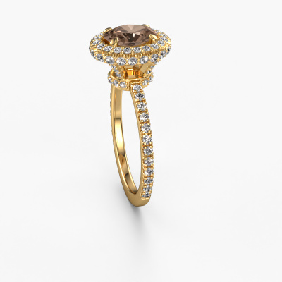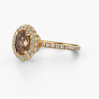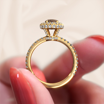 Der oben gezeigte Verlobungsring wird Talitha OVL genannt. Es ist ein Halo Ring, da er einen zentralen Edelstein und ein Band mit Pavé-Fassung hat. Der 14 Karat Gold ring ist mit einem 0.70 crt oval Braun Diamant-Mittelstein besetzt und um ihn herum eine Pavé-Fassung mit Lab grown Diamant. Was diesen klassische, Gold Halo Ring besonders macht, sind die kleineren Steine, die den zentralen Stein umschließen. Dieser wunderschöne Verlobungsring wird als Halo Ring bezeichnet, da die kleineren Edelsteine dem zentralen Stein einen Lichthof geben. Damit die kleineren Steine den Mittelstein verstärken, müssen sie so platziert werden, dass keine Lichteinflüsse auftreten. Und hier kommen unsere erfahrenen Goldschmiede ins Spiel. Jeder einzelne Stein wird sorgfältig von Hand in den Ring gesetzt. Während der Herstellung wird der Lichteinfall ständig überprüft. So können wir sicherstellen, dass der spezielle Lichtkranz noch sichtbar ist. Am Ende erhalten Sie einen einzigartigen Verlobungsring mit einem Braune Diamanten Ihrer Wahl in der Mitte. Sie können sich die Wirkung eines solchen Ringes vorstellen, wenn Sie ihn an ihrem besonderen Tag für sie zum Leuchten bringen. Durch die Kombination modernster Technik mit uralter Handwerkskunst können wir alle Verlobungsringe in unserem eigenen Studio anfertigen. Jedes Schmuckstück wird auf Anfrage gefertigt. Das ist vorteilhaft, weil wir Ihnen dadurch einen Preis anbieten können, den Sie nirgendwo anders finden.Unsere Designer und Goldschmiede arbeiten jeden Tag zusammen und versuchen, neue Schmuckstücke zu kreieren. Vielleicht haben Sie irgendwo einen schönen, klassische Verlobungsring gefunden, nach dem Ihr einzigartiger Ring gestaltet werden kann. Setzen Sie sich mit uns in Verbindung. Wir machen Ihnen ein Angebot, basierend auf einem fairen Preis/Leistungsverhältnis, das Sie begeistern wird.Um es einfacher zu machen, bieten wir eine kostenlose 30-tägige Rücksendung.