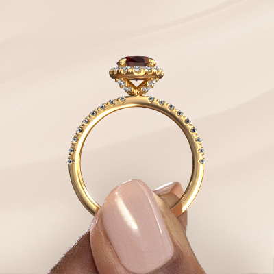 Der oben gezeigte Verlobungsring wird Miranda ovl genannt. Es ist ein Halo Ring, da er einen zentralen Edelstein und ein Band mit Pavé-Fassung hat. Der 14 Karat Gold ring ist mit einem 8x6 mm oval Granat-Mittelstein besetzt und um ihn herum eine Pavé-Fassung mit Lab grown Diamant. Was diesen exklusive, Gold Halo Ring besonders macht, sind die kleineren Steine, die den zentralen Stein umschließen. Dieser wunderschöne Verlobungsring wird als Halo Ring bezeichnet, da die kleineren Edelsteine dem zentralen Stein einen Lichthof geben. Damit die kleineren Steine den Mittelstein verstärken, müssen sie so platziert werden, dass keine Lichteinflüsse auftreten. Und hier kommen unsere erfahrenen Goldschmiede ins Spiel. Jeder einzelne Stein wird sorgfältig von Hand in den Ring gesetzt. Während der Herstellung wird der Lichteinfall ständig überprüft. So können wir sicherstellen, dass der spezielle Lichtkranz noch sichtbar ist. Am Ende erhalten Sie einen einzigartigen Verlobungsring mit einem Granat Ihrer Wahl in der Mitte. Sie können sich die Wirkung eines solchen Ringes vorstellen, wenn Sie ihn an ihrem besonderen Tag für sie zum Leuchten bringen. Durch die Kombination modernster Technik mit uralter Handwerkskunst können wir alle Verlobungsringe in unserem eigenen Studio anfertigen. Jedes Schmuckstück wird auf Anfrage gefertigt. Das ist vorteilhaft, weil wir Ihnen dadurch einen Preis anbieten können, den Sie nirgendwo anders finden.Unsere Designer und Goldschmiede arbeiten jeden Tag zusammen und versuchen, neue Schmuckstücke zu kreieren. Vielleicht haben Sie irgendwo einen schönen, exklusive Verlobungsring gefunden, nach dem Ihr einzigartiger Ring gestaltet werden kann. Setzen Sie sich mit uns in Verbindung. Wir machen Ihnen ein Angebot, basierend auf einem fairen Preis/Leistungsverhältnis, das Sie begeistern wird.Um es einfacher zu machen, bieten wir eine kostenlose 30-tägige Rücksendung.