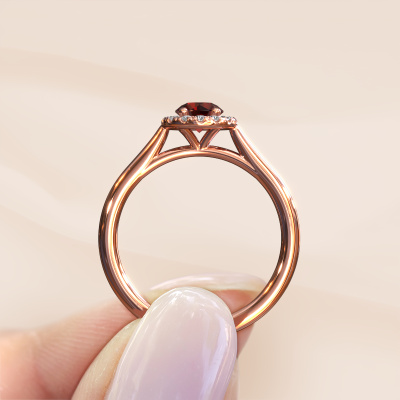 Der oben gezeigte Verlobungsring wird Seline rnd 1 genannt. Es ist ein Halo Ring, da er einen zentralen Edelstein und ein Band mit Pavé-Fassung hat. Der 14 Karat Roségold ring ist mit einem 5 mm rund Granat-Mittelstein besetzt und um ihn herum eine Pavé-Fassung mit Diamanten. Was diesen klassische, Roségold Halo Ring besonders macht, sind die kleineren Steine, die den zentralen Stein umschließen. Dieser wunderschöne Verlobungsring wird als Halo Ring bezeichnet, da die kleineren Edelsteine dem zentralen Stein einen Lichthof geben. Damit die kleineren Steine den Mittelstein verstärken, müssen sie so platziert werden, dass keine Lichteinflüsse auftreten. Und hier kommen unsere erfahrenen Goldschmiede ins Spiel. Jeder einzelne Stein wird sorgfältig von Hand in den Ring gesetzt. Während der Herstellung wird der Lichteinfall ständig überprüft. So können wir sicherstellen, dass der spezielle Lichtkranz noch sichtbar ist. Am Ende erhalten Sie einen einzigartigen Verlobungsring mit einem Granat Ihrer Wahl in der Mitte. Sie können sich die Wirkung eines solchen Ringes vorstellen, wenn Sie ihn an ihrem besonderen Tag für sie zum Leuchten bringen. Mit unserer modernen Technik können wir Schmuckstücke von höchster Qualität mit größter Sorgfalt für Sie entwerfen und anpassen. Unsere Verlobungsringe sind immer um 30 Prozent günstiger als bei anderen Juwelieren. Wir fertigen Verlobungsringe auf Bestellung, also müssen wir keine großen Lager unterhalten. Wenn Sie ein bestimmtes Budget haben, beraten wir Sie gerne entsprechend.Verschiedene Arten von neuen Ringen werden täglich von unserem Team angefertigt. Vielleicht haben Sie irgendwo einen Halo Verlobungsring gefunden. Einen, den Sie Ihrem Liebsten schenken möchten. Bitte zögern Sie nicht, unseren Schmuckdesignern Ihre Gedanken und Ihr Design zu zeigen. Wir würden gerne Ihr Design in einen klassische Verlobungsring verwandeln. Sie können die Entwicklungen Ihres Ringdesigns verfolgen, da wir sehr detaillierte 3D-Zeichnungen verwenden. Darüber hinaus können Sie einen Dummy des Designs bestellen. Ein Dummy ist ein Kunststoffring, der nach Ihrem Ringdesign gestaltet werden kann. Sie können ihn anprobieren und prüfen, ob der Verlobungsring Ihren Vorstellungen entspricht. Wir senden Ihnen gerne ein unverbindliches Angebot zu einem fairen Preis/Leistungsverhältnis. Das Angebot wird Sie angesichts der Qualität des Rings und der Edelsteine verblüffen.Um es einfacher zu machen, bieten wir eine kostenlose 30-tägige Rücksendung.