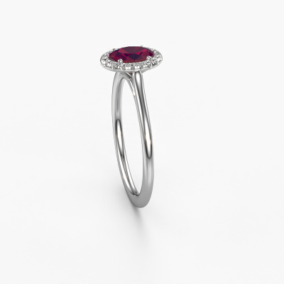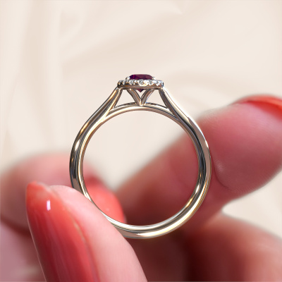 Der oben gezeigte Verlobungsring wird Seline ovl 1 genannt. Es ist ein Halo Ring, da er einen zentralen Edelstein und ein Band mit Pavé-Fassung hat. Der 14 Karat Weißgold ring ist mit einem 6x4 mm oval Rhodolit-Mittelstein besetzt und um ihn herum eine Pavé-Fassung mit Diamanten. Was diesen klassische, Weißgold Halo Ring besonders macht, sind die kleineren Steine, die den zentralen Stein umschließen. Dieser wunderschöne Verlobungsring wird als Halo Ring bezeichnet, da die kleineren Edelsteine dem zentralen Stein einen Lichthof geben. Damit die kleineren Steine den Mittelstein verstärken, müssen sie so platziert werden, dass keine Lichteinflüsse auftreten. Und hier kommen unsere erfahrenen Goldschmiede ins Spiel. Jeder einzelne Stein wird sorgfältig von Hand in den Ring gesetzt. Während der Herstellung wird der Lichteinfall ständig überprüft. So können wir sicherstellen, dass der spezielle Lichtkranz noch sichtbar ist. Am Ende erhalten Sie einen einzigartigen Verlobungsring mit einem Rhodolit Ihrer Wahl in der Mitte. Sie können sich die Wirkung eines solchen Ringes vorstellen, wenn Sie ihn an ihrem besonderen Tag für sie zum Leuchten bringen. Haben Sie ein bestimmtes Budget? Sie können uns gerne kontaktieren, damit wir Ihre Optionen besprechen können. Wir bieten unsere Verlobungsringe zum garantiert besten Preis, denn wir fertigen sie auf Bestellung. Solche Preise finden Sie nirgendwo anders!Unser Team fügt unserer Online-Kollektion täglich neue Designs hinzu. Unsere Designer und Goldschmiede arbeiten zusammen, um das beste Design zu kreieren. Wir bemühen uns, eine vielfältige Kollektion von Schmuckstücken anzubieten. Vielleicht haben Sie ein bestimmtes Design im Sinn. Eines, dass Sie irgendwo gesehen haben. Gerne geben wir Ihnen eine kostenlose Beratung. Wir machen Ihnen ein Angebot, basierend auf einem fairen Preis/Leistungsverhältnis, das Sie verblüffen wird.Um es einfacher zu machen, bieten wir eine kostenlose 30-tägige Rücksendung.