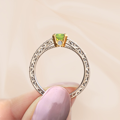 Dieser Verlobungsring aus 14 Karat Weißgold heißt Ardella und hat einen 4 mm Peridot. Ein außergewöhnlicher, Weißgold Vintage Ring. Einer, der die Liebe Ihres Lebens mit Sicherheit wie ein Peridot erstrahlen lässt! Das hoffen wir zu erreichen. Dieser Vintage Verlobungsring ist mit exquisiten Peridot besetzt. Welchen Edelstein Sie aus unserer Auswahl haben möchten, liegt ganz bei Ihnen. Der Edelstein wird mit großer Sorgfalt ausgewählt. Denn wir glauben, dass Ihr Filigrane Verlobungsring nur mit dem schönsten Edelstein gekrönt sein darf. Sehen Sie das auch so? Unser erfahrener Juwelier entwirft Ihren Ring in unserem eigenen Studio, wo der Peridot mit großer Präzision eingefasst wird. Der Ring wird dann bearbeitet und poliert, bis er perfekt ist. Nichts als das Beste für die Liebe Ihres Lebens! Jedes Schmuckstück wird von unseren Meister-Goldschmieden in unserem eigenen Studio für Sie gefertigt.Nach Erhalt Ihrer Bestellung beginnen unsere Goldschmiede mit Leidenschaft den kreativen Prozess und fertigen Ihren Verlobungsring in unserem eigenen Studio. Da wir keine großen Lager haben, werden diese Kosten nicht an Sie weitergegeben. Unsere Preisgestaltung ist der Beweis dafür! Wir bieten Schmuck zum niedrigsten Preis, garantiert.Verschiedene Arten von neuen Ringen werden täglich von unserem Team angefertigt. Vielleicht haben Sie irgendwo einen Pavé Solitär Verlobungsring gefunden. Einen, den Sie Ihrem Liebsten schenken möchten. Bitte zögern Sie nicht, unseren Schmuckdesignern Ihre Gedanken und Ihr Design zu zeigen. Wir würden gerne Ihr Design in einen Vintage Verlobungsring verwandeln. Sie können die Entwicklungen Ihres Ringdesigns verfolgen, da wir sehr detaillierte 3D-Zeichnungen verwenden. Darüber hinaus können Sie einen Dummy des Designs bestellen. Ein Dummy ist ein Kunststoffring, der nach Ihrem Ringdesign gestaltet werden kann. Sie können ihn anprobieren und prüfen, ob der Verlobungsring Ihren Vorstellungen entspricht. Wir senden Ihnen gerne ein unverbindliches Angebot zu einem fairen Preis/Leistungsverhältnis. Das Angebot wird Sie angesichts der Qualität des Rings und der Edelsteine verblüffen.Um es einfacher zu machen, bieten wir eine kostenlose 30-tägige Rücksendung.