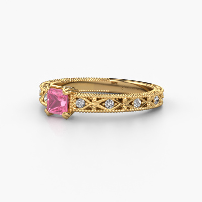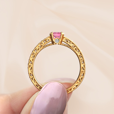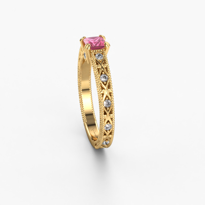Dieser Verlobungsring aus 14 Karat Gold heißt Ardella und hat einen 4 mm Pink Saphir. Ein außergewöhnlicher, Gold Vintage Ring. Einer, der die Liebe Ihres Lebens mit Sicherheit wie ein Pink Saphir erstrahlen lässt! Das hoffen wir zu erreichen. Dieser Vintage Verlobungsring ist mit exquisiten Pink Saphir besetzt. Welchen Edelstein Sie aus unserer Auswahl haben möchten, liegt ganz bei Ihnen. Der Edelstein wird mit großer Sorgfalt ausgewählt. Denn wir glauben, dass Ihr Filigrane Verlobungsring nur mit dem schönsten Edelstein gekrönt sein darf. Sehen Sie das auch so? Unser erfahrener Juwelier entwirft Ihren Ring in unserem eigenen Studio, wo der Pink Saphir mit großer Präzision eingefasst wird. Der Ring wird dann bearbeitet und poliert, bis er perfekt ist. Nichts als das Beste für die Liebe Ihres Lebens! Jedes Schmuckstück wird von unseren Meister-Goldschmieden in unserem eigenen Studio für Sie gefertigt.Nach Erhalt Ihrer Bestellung beginnen unsere Goldschmiede mit Leidenschaft den kreativen Prozess und fertigen Ihren Verlobungsring in unserem eigenen Studio. Da wir keine großen Lager haben, werden diese Kosten nicht an Sie weitergegeben. Unsere Preisgestaltung ist der Beweis dafür! Wir bieten Schmuck zum niedrigsten Preis, garantiert.Verschiedene Arten von neuen Ringen werden täglich von unserem Team angefertigt. Vielleicht haben Sie irgendwo einen Pavé Solitär Verlobungsring gefunden. Einen, den Sie Ihrem Liebsten schenken möchten. Bitte zögern Sie nicht, unseren Schmuckdesignern Ihre Gedanken und Ihr Design zu zeigen. Wir würden gerne Ihr Design in einen Vintage Verlobungsring verwandeln. Sie können die Entwicklungen Ihres Ringdesigns verfolgen, da wir sehr detaillierte 3D-Zeichnungen verwenden. Darüber hinaus können Sie einen Dummy des Designs bestellen. Ein Dummy ist ein Kunststoffring, der nach Ihrem Ringdesign gestaltet werden kann. Sie können ihn anprobieren und prüfen, ob der Verlobungsring Ihren Vorstellungen entspricht. Wir senden Ihnen gerne ein unverbindliches Angebot zu einem fairen Preis/Leistungsverhältnis. Das Angebot wird Sie angesichts der Qualität des Rings und der Edelsteine verblüffen.Um es einfacher zu machen, bieten wir eine kostenlose 30-tägige Rücksendung.