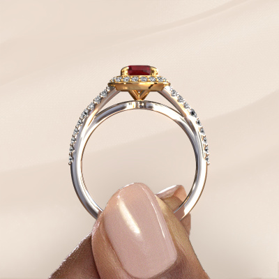 Der oben gezeigte Verlobungsring wird Pamela CUS genannt. Es ist ein Halo Ring, da er einen zentralen Edelstein und ein Band mit Pavé-Fassung hat. Der 14 Karat Weißgold ring ist mit einem 5.5 mm cussion Rubin-Mittelstein besetzt und um ihn herum eine Pavé-Fassung mit Lab grown Diamant. Was diesen Luxus, Weißgold Pavé Solitär Ring besonders macht, sind die kleineren Steine, die den zentralen Stein umschließen. Dieser wunderschöne Verlobungsring wird als Pavé Solitär Ring bezeichnet, da die kleineren Edelsteine dem zentralen Stein einen Lichthof geben. Damit die kleineren Steine den Mittelstein verstärken, müssen sie so platziert werden, dass keine Lichteinflüsse auftreten. Und hier kommen unsere erfahrenen Goldschmiede ins Spiel. Jeder einzelne Stein wird sorgfältig von Hand in den Ring gesetzt. Während der Herstellung wird der Lichteinfall ständig überprüft. So können wir sicherstellen, dass der spezielle Lichtkranz noch sichtbar ist. Am Ende erhalten Sie einen einzigartigen Verlobungsring mit einem Rubin Ihrer Wahl in der Mitte. Sie können sich die Wirkung eines solchen Ringes vorstellen, wenn Sie ihn an ihrem besonderen Tag für sie zum Leuchten bringen. Nach Erhalt Ihrer Bestellung beginnen unsere Goldschmiede mit Leidenschaft den kreativen Prozess und fertigen Ihren Verlobungsring in unserem eigenen Studio. Da wir keine großen Lager haben, werden diese Kosten nicht an Sie weitergegeben. Unsere Preisgestaltung ist der Beweis dafür! Wir bieten Schmuck zum niedrigsten Preis, garantiert.Verschiedene Arten von neuen Ringen werden täglich von unserem Team angefertigt. Vielleicht haben Sie irgendwo einen Pavé Solitär Verlobungsring gefunden. Einen, den Sie Ihrem Liebsten schenken möchten. Bitte zögern Sie nicht, unseren Schmuckdesignern Ihre Gedanken und Ihr Design zu zeigen. Wir würden gerne Ihr Design in einen Luxus Verlobungsring verwandeln. Sie können die Entwicklungen Ihres Ringdesigns verfolgen, da wir sehr detaillierte 3D-Zeichnungen verwenden. Darüber hinaus können Sie einen Dummy des Designs bestellen. Ein Dummy ist ein Kunststoffring, der nach Ihrem Ringdesign gestaltet werden kann. Sie können ihn anprobieren und prüfen, ob der Verlobungsring Ihren Vorstellungen entspricht. Wir senden Ihnen gerne ein unverbindliches Angebot zu einem fairen Preis/Leistungsverhältnis. Das Angebot wird Sie angesichts der Qualität des Rings und der Edelsteine verblüffen.Um es einfacher zu machen, bieten wir eine kostenlose 30-tägige Rücksendung.