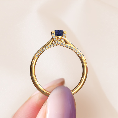 Dieser Ring aus 14 Karat Gold heißt Mia 3 und hat 5 mm Saphir. Dieser blinkende 14 Karat Gold Pavé Solitär Verlobungsring ist ein wahres Kunstwerk! Die Ornamente werden mit viel Geduld und großer Leidenschaft gefertigt. Um diesen Ring mit großer Präzision zu schaffen, erfordert dieses Handwerk ein scharfes Auge und eine geschickte Hand. Eine Herausforderung, die bei unseren erfahrenen Juwelieren ein Feuer entfacht. Die exquisiten Saphir sind auf eine besondere Art und Weise gefasst, so dass sie noch mehr hervorstechen. Dies verleiht dem Ring eine noch glamourösere Erscheinung. Der Ring an sich ist schon wegen der Edelsteine einzigartig, die wir speziell für diesen Ring auswählen. Obendrein wählen Sie die Edelmetalle aus, mit denen Ihr einzigartiger Ring für die außergewöhnlichste Frau Ihres Lebens gemacht wird! Jedes Schmuckstück ist einzigartig in jeder Hinsicht! Einfach nach Ihren Wünschen anzupassen.Haben Sie ein bestimmtes Budget? Sie können uns gerne kontaktieren, damit wir Ihre Optionen besprechen können. Wir bieten unsere Verlobungsringe zum garantiert besten Preis, denn wir fertigen sie auf Bestellung. Solche Preise finden Sie nirgendwo anders!Unser Team fügt unserer Online-Kollektion täglich neue Designs hinzu. Unsere Designer und Goldschmiede arbeiten zusammen, um das beste Design zu kreieren. Wir bemühen uns, eine vielfältige Kollektion von Schmuckstücken anzubieten. Vielleicht haben Sie ein bestimmtes Design im Sinn. Eines, dass Sie irgendwo gesehen haben. Gerne geben wir Ihnen eine kostenlose Beratung. Wir machen Ihnen ein Angebot, basierend auf einem fairen Preis/Leistungsverhältnis, das Sie verblüffen wird.Um es einfacher zu machen, bieten wir eine kostenlose 30-tägige Rücksendung.