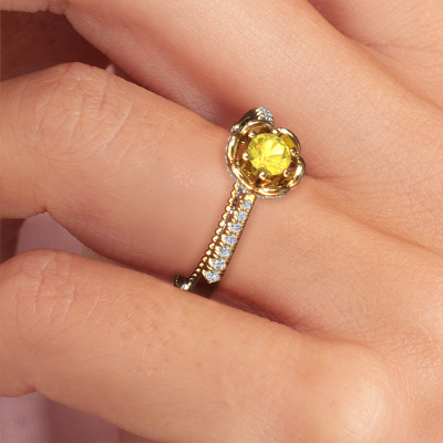 Dieser Perle Ränder Verlobungsring aus 14 Karat Gold heißt Abbey und hat 4.2 mm Gelb Saphir. Ist Ihre Freundin von Vintage begeistert? Dann wird dieser Gold Verlobungsring sicherlich perfekt zu ihrem Stil passen. Ein trendiger Ring mit einem Hauch von klassischem Schmuck. Ein wirklich atemberaubendes, romantisches Design! Vor allem, wenn Sie den Ring nach ihren Wünschen anpassen. Dieser Vintage Pavé Solitär Verlobungsring ist mit atemberaubenden Gelb Saphir besetzt. Wie Sie sehen können, sind Sie der Boss bei der Auswahl des Edelsteins, der am besten zu Ihrer Freundin passt. Jeder Edelstein wird sorgfältig von unseren Händlern ausgewählt, die auf der ganzen Welt verteilt sind. Nichts als die besten Edelsteine für unseren erfahrenen Juwelier! Schließlich ist es seine Krönung! Jedes Schmuckstück wird nur für Sie persönlich hergestellt, mit Liebe zum Detail und Design.Mit unserer modernen Technik können wir Schmuckstücke von höchster Qualität mit größter Sorgfalt für Sie entwerfen und anpassen. Unsere Verlobungsringe sind immer um 30 Prozent günstiger als bei anderen Juwelieren. Wir fertigen Verlobungsringe auf Bestellung, also müssen wir keine großen Lager unterhalten. Wenn Sie ein bestimmtes Budget haben, beraten wir Sie gerne entsprechend.Unsere Designer und Goldschmiede arbeiten jeden Tag zusammen und versuchen, neue Schmuckstücke zu kreieren. Vielleicht haben Sie irgendwo einen schönen, Vintage Verlobungsring gefunden, nach dem Ihr einzigartiger Ring gestaltet werden kann. Setzen Sie sich mit uns in Verbindung. Wir machen Ihnen ein Angebot, basierend auf einem fairen Preis/Leistungsverhältnis, das Sie begeistern wird.Um es einfacher zu machen, bieten wir eine kostenlose 30-tägige Rücksendung.