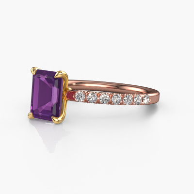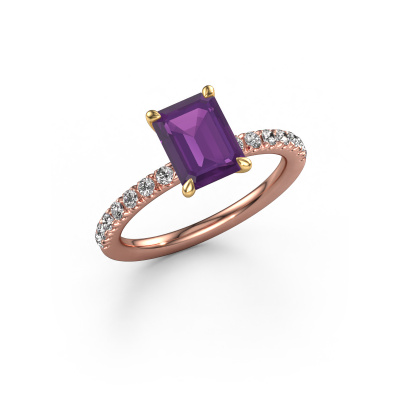 Der oben gezeigte Verlobungsring wird Crystal EME 2 genannt. Wir nennen das einen Solitär-Ring, denn er hat einen einzelnen Edelstein. Es ist ein 14 Karat Roségold Verlobungsring, mit 8x6 mm smaragd schliff Amethyst. Dieser exklusive Roségold Solitär-Ring mit exquisitem, smaragd schliff Amethyst ist ein schöner Verlobungsring. Die offenen Krappen ermöglichen, dass Licht aus mehr Winkeln auf den Edelstein trifft. Der Ring besticht auch durch die hohe Positionierung des Edelsteins. Denn Amethyst symbolisieren wahre Liebe und Reinheit und machen sie damit zum perfekten Geschenk für die Liebe Ihres Lebens. Das Symbol der ewigen Liebe ist das Herzstück dieses Solitär-Rings. Wie ein Amethyst haben auch alle anderen Arten von Edelmetallen ihre eigenen, zugeschriebenen symbolischen Bedeutungen. Diese Pavé Solitär Verlobungsring können Sie selbst zusammenstellen in verschiedenen Edelmetall Kombinationen. Dieser hat die Kombination 14 Karat Roségold mit Gold. Jedes Schmuckstück wird von unseren Meister-Goldschmieden in unserem eigenen Studio für Sie gefertigt.Durch die Kombination modernster Technik mit uralter Handwerkskunst können wir alle Verlobungsringe in unserem eigenen Studio anfertigen. Jedes Schmuckstück wird auf Anfrage gefertigt. Das ist vorteilhaft, weil wir Ihnen dadurch einen Preis anbieten können, den Sie nirgendwo anders finden.Unser Team fügt unserer Online-Kollektion täglich neue Designs hinzu. Unsere Designer und Goldschmiede arbeiten zusammen, um das beste Design zu kreieren. Wir bemühen uns, eine vielfältige Kollektion von Schmuckstücken anzubieten. Vielleicht haben Sie ein bestimmtes Design im Sinn. Eines, dass Sie irgendwo gesehen haben. Gerne geben wir Ihnen eine kostenlose Beratung. Wir machen Ihnen ein Angebot, basierend auf einem fairen Preis/Leistungsverhältnis, das Sie verblüffen wird.Um es einfacher zu machen, bieten wir eine kostenlose 30-tägige Rücksendung.