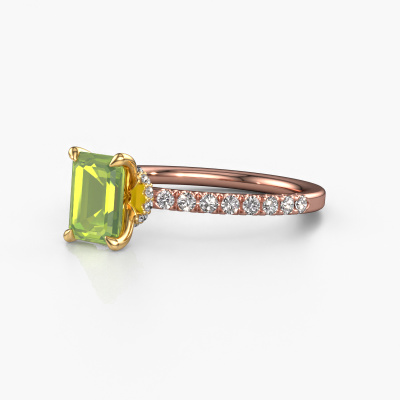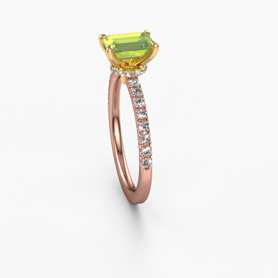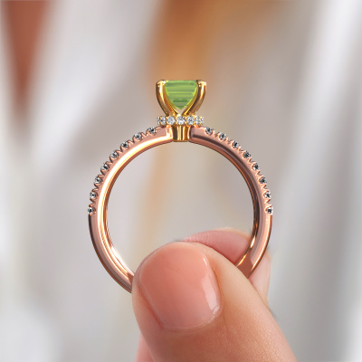 Der oben gezeigte Roségold Verlobungsring wird Crystal EME 4 genannt. Es ist ein Pavé Solitär Ring, da er einen zentralen Edelstein und ein Band mit Pavé-Fassung hat. Der modische Pavé Solitär Verlobungsring ist in der Kombination 14 Karat Roségold mit Gold und ist mit einem smaragd schliff 7x5 mm Peridot-Mittelstein besetzt und das Band hat eine Pavé-Fassung mit Lab grown Diamant. Jedes Schmuckstück ist um Ihrem Finger Glanz zu verleihen. Jeder Ring wird von unseren Goldschmieden liebevoll von Hand gefertigt. Um den zentralen Stein noch mehr zu betonen, hat das Band eine Pavé-Fassung mit weiteren Peridot. Durch die offenen Krappen kann das Licht aus mehreren Winkeln auf den Peridot treffen und der Peridot-Ring funkelt noch mehr. Das obere Foto zeigt die leidenschaftlich handgefertigten Details des Rings. Die hohe Positionierung der Mittelstein ist ein echter Blickfang. Der perfekte Verlobungsring für das Kronjuwel Ihres Lebens!Nach Erhalt Ihrer Bestellung beginnen unsere Goldschmiede mit Leidenschaft den kreativen Prozess und fertigen Ihren Verlobungsring in unserem eigenen Studio. Da wir keine großen Lager haben, werden diese Kosten nicht an Sie weitergegeben. Unsere Preisgestaltung ist der Beweis dafür! Wir bieten Schmuck zum niedrigsten Preis, garantiert.Unser Team fügt unserer Online-Kollektion täglich neue Designs hinzu. Unsere Designer und Goldschmiede arbeiten zusammen, um das beste Design zu kreieren. Wir bemühen uns, eine vielfältige Kollektion von Schmuckstücken anzubieten. Vielleicht haben Sie ein bestimmtes Design im Sinn. Eines, dass Sie irgendwo gesehen haben. Gerne geben wir Ihnen eine kostenlose Beratung. Wir machen Ihnen ein Angebot, basierend auf einem fairen Preis/Leistungsverhältnis, das Sie verblüffen wird.Um es einfacher zu machen, bieten wir eine kostenlose 30-tägige Rücksendung.