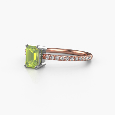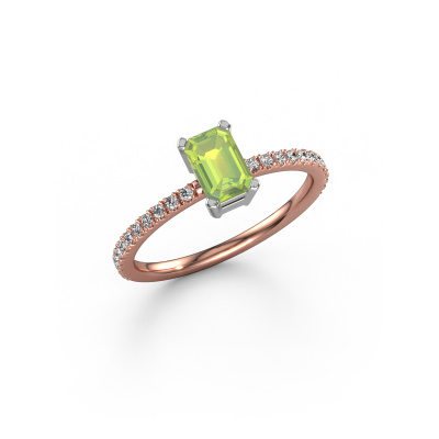 Der oben gezeigte Ring wird Denita 2 EME genannt. Es ist ein Pavé Solitär Ring, da er einen zentralen Edelstein und ein Band mit Pavé-Fassung hat. Dieser 14 Karat Roségold ring ist mit einem 6x4 mm smaragd schliff Peridot-Mittelstein besetzt und das Band hat eine Pavé-Fassung mit Diamanten. Jedes Schmuckstück wird von unseren Meister-Goldschmieden in unserem eigenen Studio für Sie gefertigt.Dieser traditionell Roségold Pavé Solitär Verlobungsring mit Pavé-Fassung hat einen exquisiten, smaragd schliff Peridot als Mittelstein. Um den zentralen Stein noch mehr zu betonen, hat das Band eine Pavé-Fassung mit weiteren Diamanten. Durch die offenen Krappen kann das Licht aus mehreren Winkeln auf den Peridot treffen und der Peridot-Ring funkelt noch mehr. Das obere Foto zeigt die leidenschaftlich handgefertigten Details des Rings. Die hohe Positionierung der Mittelstein ist ein echter Blickfang. Der perfekte Verlobungsring für das Kronjuwel Ihres Lebens!Haben Sie ein bestimmtes Budget? Sie können uns gerne kontaktieren, damit wir Ihre Optionen besprechen können. Wir bieten unsere Verlobungsringe zum garantiert besten Preis, denn wir fertigen sie auf Bestellung. Solche Preise finden Sie nirgendwo anders!Unser Team fügt unserer Online-Kollektion täglich neue Designs hinzu. Unsere Designer und Goldschmiede arbeiten zusammen, um das beste Design zu kreieren. Wir bemühen uns, eine vielfältige Kollektion von Schmuckstücken anzubieten. Vielleicht haben Sie ein bestimmtes Design im Sinn. Eines, dass Sie irgendwo gesehen haben. Gerne geben wir Ihnen eine kostenlose Beratung. Wir machen Ihnen ein Angebot, basierend auf einem fairen Preis/Leistungsverhältnis, das Sie verblüffen wird.Um es einfacher zu machen, bieten wir eine kostenlose 30-tägige Rücksendung.