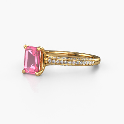 Der oben gezeigte Ring wird Elenore eme genannt. Es ist ein Pavé Solitär Ring, da er einen zentralen Edelstein und ein Band mit Pavé-Fassung hat. Dieser 14 Karat Gold ring ist mit einem 7x5 mm smaragd schliff Pink Saphir-Mittelstein besetzt und das Band hat eine Pavé-Fassung mit Lab grown Diamant. Jedes Schmuckstück wird nur für Sie persönlich hergestellt, mit Liebe zum Detail und Design.Dieser exklusive Gold Pavé Solitär Verlobungsring mit Pavé-Fassung hat einen exquisiten, smaragd schliff Pink Saphir als Mittelstein. Um den zentralen Stein noch mehr zu betonen, hat das Band eine Pavé-Fassung mit weiteren Lab grown Diamant. Durch die offenen Krappen kann das Licht aus mehreren Winkeln auf den Pink Saphir treffen und der Pink Saphir-Ring funkelt noch mehr. Das obere Foto zeigt die leidenschaftlich handgefertigten Details des Rings. Die hohe Positionierung der Mittelstein ist ein echter Blickfang. Der perfekte Verlobungsring für das Kronjuwel Ihres Lebens!Haben Sie ein bestimmtes Budget? Sie können uns gerne kontaktieren, damit wir Ihre Optionen besprechen können. Wir bieten unsere Verlobungsringe zum garantiert besten Preis, denn wir fertigen sie auf Bestellung. Solche Preise finden Sie nirgendwo anders!Haben Sie irgendwo einen bestimmten Verlobungsring gefunden, den Sie Ihrem Liebsten schenken möchten? Sie können uns gerne sagen, was Sie wollen und wir werden Ihr Design in einen Einzigartigen exklusive Verlobungsring verwandeln. Sie können die Entwicklungen Ihres Ringdesigns verfolgen, da wir 3D-Zeichnungen verwenden. Das gibt Ihnen eine realistische Vorschau, wie Ihr Design aussehen wird. Sie können auch einen Dummy vorbestellen. Ein Dummy ist ein Kunststoffring, der nach Ihrem Ringdesign gestaltet werden kann. Sie können ihn anprobieren und prüfen, ob seine Breite und Größe für Sie geeignet sind. Wir senden Ihnen gerne ein unverbindliches Angebot zu einem fairen Preis/Leistungsverhältnis. Sie werden in Anbetracht der Qualität des Rings und der Edelsteine überrascht sein.Um es einfacher zu machen, bieten wir eine kostenlose 30-tägige Rücksendung.