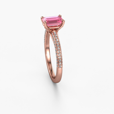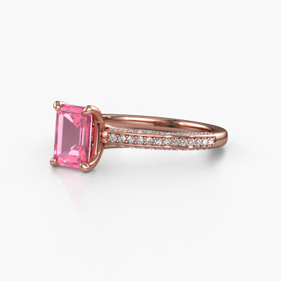 Der oben gezeigte Ring wird Elenore eme genannt. Es ist ein Pavé Solitär Ring, da er einen zentralen Edelstein und ein Band mit Pavé-Fassung hat. Dieser 14 Karat Roségold ring ist mit einem 7x5 mm smaragd schliff Pink Saphir-Mittelstein besetzt und das Band hat eine Pavé-Fassung mit Lab grown Diamant. Jedes Schmuckstück wird nur für Sie persönlich hergestellt, mit Liebe zum Detail und Design.Dieser exklusive Roségold Pavé Solitär Verlobungsring mit Pavé-Fassung hat einen exquisiten, smaragd schliff Pink Saphir als Mittelstein. Um den zentralen Stein noch mehr zu betonen, hat das Band eine Pavé-Fassung mit weiteren Lab grown Diamant. Durch die offenen Krappen kann das Licht aus mehreren Winkeln auf den Pink Saphir treffen und der Pink Saphir-Ring funkelt noch mehr. Das obere Foto zeigt die leidenschaftlich handgefertigten Details des Rings. Die hohe Positionierung der Mittelstein ist ein echter Blickfang. Der perfekte Verlobungsring für das Kronjuwel Ihres Lebens!Haben Sie ein bestimmtes Budget? Sie können uns gerne kontaktieren, damit wir Ihre Optionen besprechen können. Wir bieten unsere Verlobungsringe zum garantiert besten Preis, denn wir fertigen sie auf Bestellung. Solche Preise finden Sie nirgendwo anders!Haben Sie irgendwo einen bestimmten Verlobungsring gefunden, den Sie Ihrem Liebsten schenken möchten? Sie können uns gerne sagen, was Sie wollen und wir werden Ihr Design in einen Einzigartigen exklusive Verlobungsring verwandeln. Sie können die Entwicklungen Ihres Ringdesigns verfolgen, da wir 3D-Zeichnungen verwenden. Das gibt Ihnen eine realistische Vorschau, wie Ihr Design aussehen wird. Sie können auch einen Dummy vorbestellen. Ein Dummy ist ein Kunststoffring, der nach Ihrem Ringdesign gestaltet werden kann. Sie können ihn anprobieren und prüfen, ob seine Breite und Größe für Sie geeignet sind. Wir senden Ihnen gerne ein unverbindliches Angebot zu einem fairen Preis/Leistungsverhältnis. Sie werden in Anbetracht der Qualität des Rings und der Edelsteine überrascht sein.Um es einfacher zu machen, bieten wir eine kostenlose 30-tägige Rücksendung.