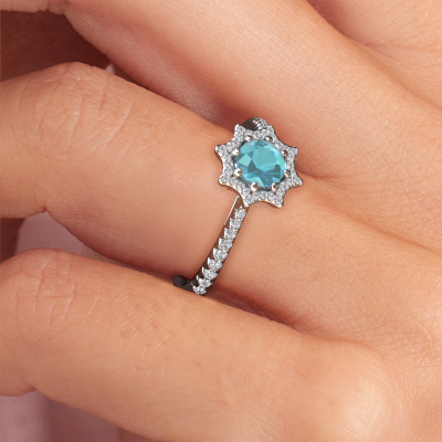 Dieser Verlobungsring aus Platin heißt Zena und hat einen Blau Topas Edelstein. Ein außergewöhnlicher, Platin Vintage Ring. Einer, der die Liebe Ihres Lebens mit Sicherheit wie ein Blau Topas erstrahlen lässt! Das hoffen wir zu erreichen.