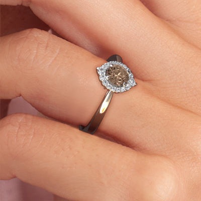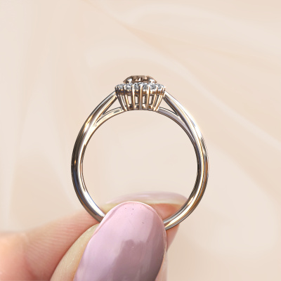 Der oben gezeigte Ring wird Tora genannt. Ein Cluster Ring mit einem zentralen Edelstein, umgeben von kleineren Steinen, wir nennen das einen Cluster Ring. Diese Version in Platin hat einen 0.50 crt rund Braun Diamant als Mittelstein, umschlossen von kleineren Lab grown Diamant. Der klassische, Platin Cluster Verlobungsring zeichnet sich durch seine Form aus. Zusammen bilden die kleineren und größeren Braun Diamant eine Blume und scheinen zu einem großen, funkelnden Edelstein zu verschmelzen. Dieser klassische Verlobungsring wird auch als Blumen- oder Rosettenring bezeichnet. Unsere erfahrenen Juweliere stellen sicher, dass die kleineren Lab grown Diamant identisch gesetzt sind, so dass es an dem Braun Diamant keine Lichtstörungen gibt, sondern sie stattdessen eine Einheit bilden. Mit perfekter Präzision und geschickter Hand wird jeder Braun Diamant in den Ring gesetzt. Während der Herstellung wird alles ständig überwacht, um sicherzustellen, dass das Licht einwandfrei reflektiert wird. Das alles führt zu einem einzigartigen Verlobungsring mit einem strahlenden Braune Diamanten in seiner Mitte. Ein schönes, bedeutungsvolles Geschenk, um es der Liebe Ihres Lebens zu schenken. Durch die Kombination modernster Technik mit uralter Handwerkskunst können wir alle Verlobungsringe in unserem eigenen Studio anfertigen. Jedes Schmuckstück wird auf Anfrage gefertigt. Das ist vorteilhaft, weil wir Ihnen dadurch einen Preis anbieten können, den Sie nirgendwo anders finden.Haben Sie irgendwo einen bestimmten Verlobungsring gefunden, den Sie Ihrem Liebsten schenken möchten? Sie können uns gerne sagen, was Sie wollen und wir werden Ihr Design in einen Einzigartigen klassische Verlobungsring verwandeln. Sie können die Entwicklungen Ihres Ringdesigns verfolgen, da wir 3D-Zeichnungen verwenden. Das gibt Ihnen eine realistische Vorschau, wie Ihr Design aussehen wird. Sie können auch einen Dummy vorbestellen. Ein Dummy ist ein Kunststoffring, der nach Ihrem Ringdesign gestaltet werden kann. Sie können ihn anprobieren und prüfen, ob seine Breite und Größe für Sie geeignet sind. Wir senden Ihnen gerne ein unverbindliches Angebot zu einem fairen Preis/Leistungsverhältnis. Sie werden in Anbetracht der Qualität des Rings und der Edelsteine überrascht sein.Um es einfacher zu machen, bieten wir eine kostenlose 30-tägige Rücksendung.