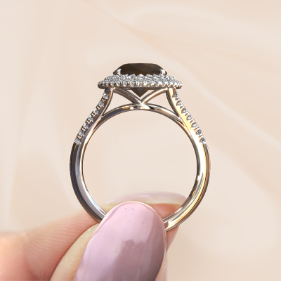 Der oben gezeigte Verlobungsring wird Elvie genannt. Es ist ein Halo Ring, da er einen zentralen Edelstein und ein Band mit Pavé-Fassung hat. Der Platin ring ist mit einem 10x8 mm oval Rauchquarz-Mittelstein besetzt und um ihn herum eine Pavé-Fassung mit Lab grown Diamant. Was diesen Vintage, Platin Pavé Solitär Ring besonders macht, sind die kleineren Steine, die den zentralen Stein umschließen. Dieser wunderschöne Verlobungsring wird als Pavé Solitär Ring bezeichnet, da die kleineren Edelsteine dem zentralen Stein einen Lichthof geben. Damit die kleineren Steine den Mittelstein verstärken, müssen sie so platziert werden, dass keine Lichteinflüsse auftreten. Und hier kommen unsere erfahrenen Goldschmiede ins Spiel. Jeder einzelne Stein wird sorgfältig von Hand in den Ring gesetzt. Während der Herstellung wird der Lichteinfall ständig überprüft. So können wir sicherstellen, dass der spezielle Lichtkranz noch sichtbar ist. Am Ende erhalten Sie einen einzigartigen Verlobungsring mit einem Rauchquarz Ihrer Wahl in der Mitte. Sie können sich die Wirkung eines solchen Ringes vorstellen, wenn Sie ihn an ihrem besonderen Tag für sie zum Leuchten bringen. Mit unserer modernen Technik können wir Schmuckstücke von höchster Qualität mit größter Sorgfalt für Sie entwerfen und anpassen. Unsere Verlobungsringe sind immer um 30 Prozent günstiger als bei anderen Juwelieren. Wir fertigen Verlobungsringe auf Bestellung, also müssen wir keine großen Lager unterhalten. Wenn Sie ein bestimmtes Budget haben, beraten wir Sie gerne entsprechend.Haben Sie einen bestimmten Ring im Sinn? Eines, dass Sie irgendwo gesehen haben. Bitte zögern Sie nicht, uns zu sagen, was Sie wollen und wir werden Ihr Design in einen Einzigartigen Verlobungsring verwandeln. Sie können die Entwicklungen Ihres Ringdesigns verfolgen, da wir 3D-Zeichnungen verwenden. Das gibt Ihnen eine realistische Vorschau Ihres Designs. Wir senden Ihnen gerne ein unverbindliches Angebot zu einem fairen Preis/Leistungsverhältnis. Es wird Sie erstaunen.Um es einfacher zu machen, bieten wir eine kostenlose 30-tägige Rücksendung.