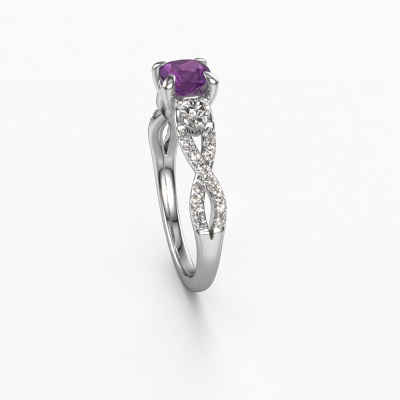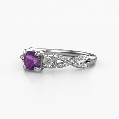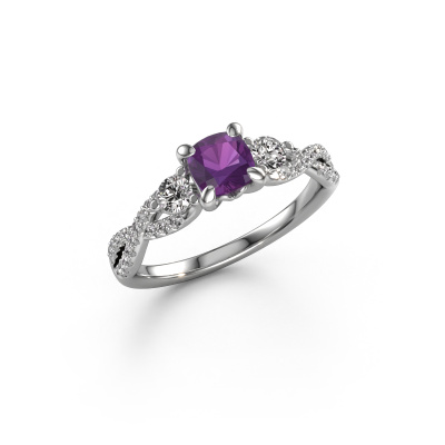 Der oben gezeigte Platin Verlobungsring wird Marilou CUS genannt. Es ist ein 3-stone Ring, da er einen zentralen Edelstein und ein Band mit Pavé-Fassung hat. Der traditionell 3-stone Verlobungsring ist in der Kombination Platin mit Platin und ist mit einem cussion 5 mm Amethyst-Mittelstein besetzt und das Band hat eine Pavé-Fassung mit Diamanten. Jedes Schmuckstück ist einzigartig in jeder Hinsicht! Einfach nach Ihren Wünschen anzupassen. Um den zentralen Stein noch mehr zu betonen, hat das Band eine Pavé-Fassung mit weiteren Amethyst. Durch die offenen Krappen kann das Licht aus mehreren Winkeln auf den Amethyst treffen und der Amethyst-Ring funkelt noch mehr. Das obere Foto zeigt die leidenschaftlich handgefertigten Details des Rings. Die hohe Positionierung der Mittelstein ist ein echter Blickfang. Der perfekte Verlobungsring für das Kronjuwel Ihres Lebens!Durch die Kombination modernster Technik mit uralter Handwerkskunst können wir alle Verlobungsringe in unserem eigenen Studio anfertigen. Jedes Schmuckstück wird auf Anfrage gefertigt. Das ist vorteilhaft, weil wir Ihnen dadurch einen Preis anbieten können, den Sie nirgendwo anders finden.Unser Team fügt unserer Online-Kollektion täglich neue Designs hinzu. Unsere Designer und Goldschmiede arbeiten zusammen, um das beste Design zu kreieren. Wir bemühen uns, eine vielfältige Kollektion von Schmuckstücken anzubieten. Vielleicht haben Sie ein bestimmtes Design im Sinn. Eines, dass Sie irgendwo gesehen haben. Gerne geben wir Ihnen eine kostenlose Beratung. Wir machen Ihnen ein Angebot, basierend auf einem fairen Preis/Leistungsverhältnis, das Sie verblüffen wird.Um es einfacher zu machen, bieten wir eine kostenlose 30-tägige Rücksendung.