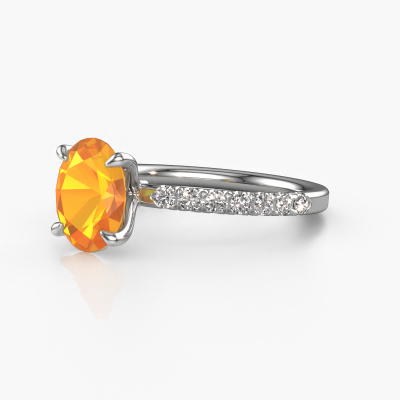 Der oben gezeigte Platin Verlobungsring wird Crystal OVL 2 genannt. Es ist ein Pavé Solitär Ring, da er einen zentralen Edelstein und ein Band mit Pavé-Fassung hat. Der exklusive Pavé Solitär Verlobungsring ist in der Kombination Platin mit Platin und ist mit einem oval 9x7 mm Citrin-Mittelstein besetzt und das Band hat eine Pavé-Fassung mit Lab grown Diamant. Jedes Schmuckstück wird von unseren Meister-Goldschmieden in unserem eigenen Studio für Sie gefertigt. Um den zentralen Stein noch mehr zu betonen, hat das Band eine Pavé-Fassung mit weiteren Citrin. Durch die offenen Krappen kann das Licht aus mehreren Winkeln auf den Citrin treffen und der Citrin-Ring funkelt noch mehr. Das obere Foto zeigt die leidenschaftlich handgefertigten Details des Rings. Die hohe Positionierung der Mittelstein ist ein echter Blickfang. Der perfekte Verlobungsring für das Kronjuwel Ihres Lebens!Durch die Kombination modernster Technik mit uralter Handwerkskunst können wir alle Verlobungsringe in unserem eigenen Studio anfertigen. Jedes Schmuckstück wird auf Anfrage gefertigt. Das ist vorteilhaft, weil wir Ihnen dadurch einen Preis anbieten können, den Sie nirgendwo anders finden.Unser Team fügt unserer Online-Kollektion täglich neue Designs hinzu. Unsere Designer und Goldschmiede arbeiten zusammen, um das beste Design zu kreieren. Wir bemühen uns, eine vielfältige Kollektion von Schmuckstücken anzubieten. Vielleicht haben Sie ein bestimmtes Design im Sinn. Eines, dass Sie irgendwo gesehen haben. Gerne geben wir Ihnen eine kostenlose Beratung. Wir machen Ihnen ein Angebot, basierend auf einem fairen Preis/Leistungsverhältnis, das Sie verblüffen wird.Um es einfacher zu machen, bieten wir eine kostenlose 30-tägige Rücksendung.
