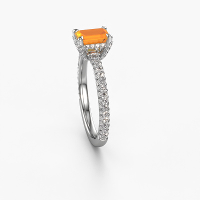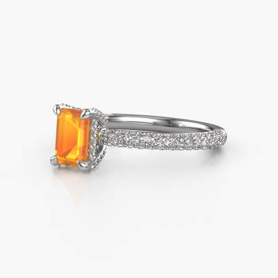 Der oben gezeigte Platin Verlobungsring wird Saskia eme 2 genannt. Es ist ein Pavé Solitär Ring, da er einen zentralen Edelstein und ein Band mit Pavé-Fassung hat. Der exklusive Pavé Solitär Verlobungsring ist in der Kombination Platin mit Platin und ist mit einem smaragd schliff 6.5x4.5 mm Citrin-Mittelstein besetzt und das Band hat eine Pavé-Fassung mit Diamanten. Jedes Schmuckstück wird hergestellt von einem Team leidenschaftlicher Goldschmiede und Schmuckdesigner. Das wird Ihr Kronjuwel unbedingt zu einem Blickfang machen. Um den zentralen Stein noch mehr zu betonen, hat das Band eine Pavé-Fassung mit weiteren Citrin. Durch die offenen Krappen kann das Licht aus mehreren Winkeln auf den Citrin treffen und der Citrin-Ring funkelt noch mehr. Das obere Foto zeigt die leidenschaftlich handgefertigten Details des Rings. Die hohe Positionierung der Mittelstein ist ein echter Blickfang. Der perfekte Verlobungsring für das Kronjuwel Ihres Lebens!Mit unserer modernen Technik können wir Schmuckstücke von höchster Qualität mit größter Sorgfalt für Sie entwerfen und anpassen. Unsere Verlobungsringe sind immer um 30 Prozent günstiger als bei anderen Juwelieren. Wir fertigen Verlobungsringe auf Bestellung, also müssen wir keine großen Lager unterhalten. Wenn Sie ein bestimmtes Budget haben, beraten wir Sie gerne entsprechend.Verschiedene Arten von neuen Ringen werden täglich von unserem Team angefertigt. Vielleicht haben Sie irgendwo einen Pavé Solitär Verlobungsring gefunden. Einen, den Sie Ihrem Liebsten schenken möchten. Bitte zögern Sie nicht, unseren Schmuckdesignern Ihre Gedanken und Ihr Design zu zeigen. Wir würden gerne Ihr Design in einen exklusive Verlobungsring verwandeln. Sie können die Entwicklungen Ihres Ringdesigns verfolgen, da wir sehr detaillierte 3D-Zeichnungen verwenden. Darüber hinaus können Sie einen Dummy des Designs bestellen. Ein Dummy ist ein Kunststoffring, der nach Ihrem Ringdesign gestaltet werden kann. Sie können ihn anprobieren und prüfen, ob der Verlobungsring Ihren Vorstellungen entspricht. Wir senden Ihnen gerne ein unverbindliches Angebot zu einem fairen Preis/Leistungsverhältnis. Das Angebot wird Sie angesichts der Qualität des Rings und der Edelsteine verblüffen.Um es einfacher zu machen, bieten wir eine kostenlose 30-tägige Rücksendung.