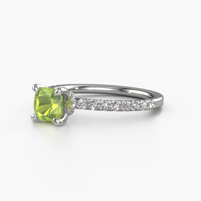 Der oben gezeigte Platin Verlobungsring wird Crystal CUS 4 genannt. Es ist ein Pavé Solitär Ring, da er einen zentralen Edelstein und ein Band mit Pavé-Fassung hat. Der schicke Pavé Solitär Verlobungsring ist in der Kombination Platin mit Platin und ist mit einem cussion 5.5 mm Peridot-Mittelstein besetzt und das Band hat eine Pavé-Fassung mit Diamanten. Jedes Schmuckstück ist um Ihrem Finger Glanz zu verleihen. Jeder Ring wird von unseren Goldschmieden liebevoll von Hand gefertigt. Um den zentralen Stein noch mehr zu betonen, hat das Band eine Pavé-Fassung mit weiteren Peridot. Durch die offenen Krappen kann das Licht aus mehreren Winkeln auf den Peridot treffen und der Peridot-Ring funkelt noch mehr. Das obere Foto zeigt die leidenschaftlich handgefertigten Details des Rings. Die hohe Positionierung der Mittelstein ist ein echter Blickfang. Der perfekte Verlobungsring für das Kronjuwel Ihres Lebens!Mit unserer modernen Technik können wir Schmuckstücke von höchster Qualität mit größter Sorgfalt für Sie entwerfen und anpassen. Unsere Verlobungsringe sind immer um 30 Prozent günstiger als bei anderen Juwelieren. Wir fertigen Verlobungsringe auf Bestellung, also müssen wir keine großen Lager unterhalten. Wenn Sie ein bestimmtes Budget haben, beraten wir Sie gerne entsprechend.Haben Sie einen bestimmten Ring im Sinn? Eines, dass Sie irgendwo gesehen haben. Bitte zögern Sie nicht, uns zu sagen, was Sie wollen und wir werden Ihr Design in einen Einzigartigen Verlobungsring verwandeln. Sie können die Entwicklungen Ihres Ringdesigns verfolgen, da wir 3D-Zeichnungen verwenden. Das gibt Ihnen eine realistische Vorschau Ihres Designs. Wir senden Ihnen gerne ein unverbindliches Angebot zu einem fairen Preis/Leistungsverhältnis. Es wird Sie erstaunen.Um es einfacher zu machen, bieten wir eine kostenlose 30-tägige Rücksendung.