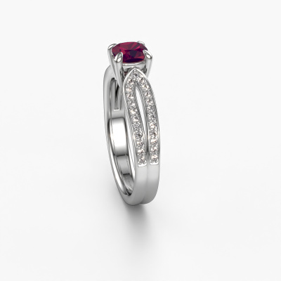 Der oben gezeigte Platin Verlobungsring wird Antonia cus 2 genannt. Es ist ein Pavé Solitär Ring, da er einen zentralen Edelstein und ein Band mit Pavé-Fassung hat. Der Fantasie Pavé Solitär Verlobungsring ist in der Kombination Platin mit Platin und ist mit einem cussion 5 mm Rhodolit-Mittelstein besetzt und das Band hat eine Pavé-Fassung mit Lab grown Diamant. Jedes Schmuckstück wird von unseren Meister-Goldschmieden in unserem eigenen Studio für Sie gefertigt. Um den zentralen Stein noch mehr zu betonen, hat das Band eine Pavé-Fassung mit weiteren Rhodolit. Durch die offenen Krappen kann das Licht aus mehreren Winkeln auf den Rhodolit treffen und der Rhodolit-Ring funkelt noch mehr. Das obere Foto zeigt die leidenschaftlich handgefertigten Details des Rings. Die hohe Positionierung der Mittelstein ist ein echter Blickfang. Der perfekte Verlobungsring für das Kronjuwel Ihres Lebens!Mit unserer modernen Technik können wir Schmuckstücke von höchster Qualität mit größter Sorgfalt für Sie entwerfen und anpassen. Unsere Verlobungsringe sind immer um 30 Prozent günstiger als bei anderen Juwelieren. Wir fertigen Verlobungsringe auf Bestellung, also müssen wir keine großen Lager unterhalten. Wenn Sie ein bestimmtes Budget haben, beraten wir Sie gerne entsprechend.Haben Sie irgendwo einen bestimmten Verlobungsring gefunden, den Sie Ihrem Liebsten schenken möchten? Sie können uns gerne sagen, was Sie wollen und wir werden Ihr Design in einen Einzigartigen Fantasie Verlobungsring verwandeln. Sie können die Entwicklungen Ihres Ringdesigns verfolgen, da wir 3D-Zeichnungen verwenden. Das gibt Ihnen eine realistische Vorschau, wie Ihr Design aussehen wird. Sie können auch einen Dummy vorbestellen. Ein Dummy ist ein Kunststoffring, der nach Ihrem Ringdesign gestaltet werden kann. Sie können ihn anprobieren und prüfen, ob seine Breite und Größe für Sie geeignet sind. Wir senden Ihnen gerne ein unverbindliches Angebot zu einem fairen Preis/Leistungsverhältnis. Sie werden in Anbetracht der Qualität des Rings und der Edelsteine überrascht sein.Um es einfacher zu machen, bieten wir eine kostenlose 30-tägige Rücksendung.