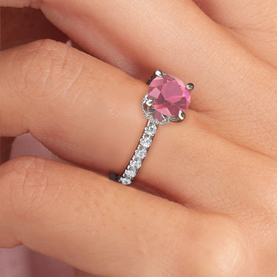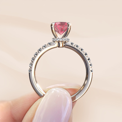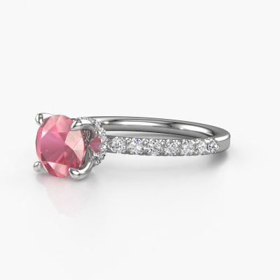 Der oben gezeigte Platin Verlobungsring wird Crystal rnd 4 genannt. Es ist ein Pavé Solitär Ring, da er einen zentralen Edelstein und ein Band mit Pavé-Fassung hat. Der Fantasie Pavé Solitär Verlobungsring ist in der Kombination Platin mit Platin und ist mit einem rund 7 mm Turmalin rosa-Mittelstein besetzt und das Band hat eine Pavé-Fassung mit Lab grown Diamant. Jedes Schmuckstück lässt Ihren Finger erstrahlen. Ihr Ring ist mit Liebe von unseren Goldschmieden handgefertigt. Um den zentralen Stein noch mehr zu betonen, hat das Band eine Pavé-Fassung mit weiteren Turmalin rosa. Durch die offenen Krappen kann das Licht aus mehreren Winkeln auf den Turmalin rosa treffen und der Turmalin rosa-Ring funkelt noch mehr. Das obere Foto zeigt die leidenschaftlich handgefertigten Details des Rings. Die hohe Positionierung der Mittelstein ist ein echter Blickfang. Der perfekte Verlobungsring für das Kronjuwel Ihres Lebens!Mit unserer modernen Technik können wir Schmuckstücke von höchster Qualität mit größter Sorgfalt für Sie entwerfen und anpassen. Unsere Verlobungsringe sind immer um 30 Prozent günstiger als bei anderen Juwelieren. Wir fertigen Verlobungsringe auf Bestellung, also müssen wir keine großen Lager unterhalten. Wenn Sie ein bestimmtes Budget haben, beraten wir Sie gerne entsprechend.Haben Sie irgendwo einen bestimmten Verlobungsring gefunden, den Sie Ihrem Liebsten schenken möchten? Sie können uns gerne sagen, was Sie wollen und wir werden Ihr Design in einen Einzigartigen Fantasie Verlobungsring verwandeln. Sie können die Entwicklungen Ihres Ringdesigns verfolgen, da wir 3D-Zeichnungen verwenden. Das gibt Ihnen eine realistische Vorschau, wie Ihr Design aussehen wird. Sie können auch einen Dummy vorbestellen. Ein Dummy ist ein Kunststoffring, der nach Ihrem Ringdesign gestaltet werden kann. Sie können ihn anprobieren und prüfen, ob seine Breite und Größe für Sie geeignet sind. Wir senden Ihnen gerne ein unverbindliches Angebot zu einem fairen Preis/Leistungsverhältnis. Sie werden in Anbetracht der Qualität des Rings und der Edelsteine überrascht sein.Um es einfacher zu machen, bieten wir eine kostenlose 30-tägige Rücksendung.