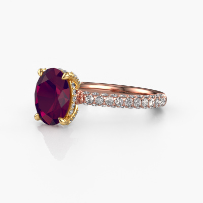 Der oben gezeigte Roségold Verlobungsring wird Saskia 2 ovl genannt. Es ist ein Pavé Solitär Ring, da er einen zentralen Edelstein und ein Band mit Pavé-Fassung hat. Der exklusive Pavé Solitär Verlobungsring ist in der Kombination 14 Karat Roségold mit Gold und ist mit einem oval 9x7 mm Rhodolit-Mittelstein besetzt und das Band hat eine Pavé-Fassung mit Lab grown Diamant. Jedes Schmuckstück wird von unseren Meister-Goldschmieden in unserem eigenen Studio für Sie gefertigt. Um den zentralen Stein noch mehr zu betonen, hat das Band eine Pavé-Fassung mit weiteren Rhodolit. Durch die offenen Krappen kann das Licht aus mehreren Winkeln auf den Rhodolit treffen und der Rhodolit-Ring funkelt noch mehr. Das obere Foto zeigt die leidenschaftlich handgefertigten Details des Rings. Die hohe Positionierung der Mittelstein ist ein echter Blickfang. Der perfekte Verlobungsring für das Kronjuwel Ihres Lebens!Nach Erhalt Ihrer Bestellung beginnen unsere Goldschmiede mit Leidenschaft den kreativen Prozess und fertigen Ihren Verlobungsring in unserem eigenen Studio. Da wir keine großen Lager haben, werden diese Kosten nicht an Sie weitergegeben. Unsere Preisgestaltung ist der Beweis dafür! Wir bieten Schmuck zum niedrigsten Preis, garantiert.Haben Sie irgendwo einen bestimmten Verlobungsring gefunden, den Sie Ihrem Liebsten schenken möchten? Sie können uns gerne sagen, was Sie wollen und wir werden Ihr Design in einen Einzigartigen exklusive Verlobungsring verwandeln. Sie können die Entwicklungen Ihres Ringdesigns verfolgen, da wir 3D-Zeichnungen verwenden. Das gibt Ihnen eine realistische Vorschau, wie Ihr Design aussehen wird. Sie können auch einen Dummy vorbestellen. Ein Dummy ist ein Kunststoffring, der nach Ihrem Ringdesign gestaltet werden kann. Sie können ihn anprobieren und prüfen, ob seine Breite und Größe für Sie geeignet sind. Wir senden Ihnen gerne ein unverbindliches Angebot zu einem fairen Preis/Leistungsverhältnis. Sie werden in Anbetracht der Qualität des Rings und der Edelsteine überrascht sein.Um es einfacher zu machen, bieten wir eine kostenlose 30-tägige Rücksendung.