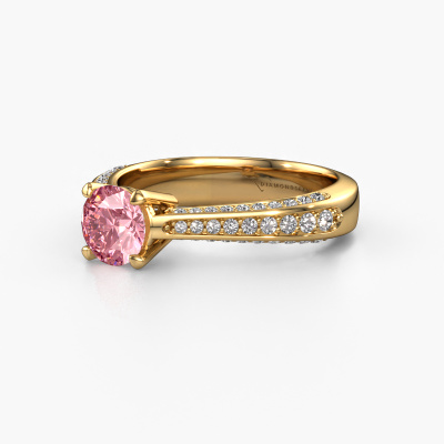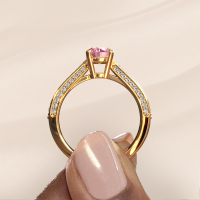 Der oben gezeigte Ring wird Ruby rnd genannt. Es ist ein Pavé Solitär Ring, da er einen zentralen Edelstein und ein Band mit Pavé-Fassung hat. Dieser 14 Karat Gold ring ist mit einem 5.7 mm rund rosa Labordiamant-Mittelstein besetzt und das Band hat eine Pavé-Fassung mit Diamanten. Jedes Schmuckstück wird nur für Sie persönlich hergestellt, mit Liebe zum Detail und Design.Dieser exklusive Gold Pavé Solitär Verlobungsring mit Pavé-Fassung hat einen exquisiten, rund rosa Labordiamant als Mittelstein. Um den zentralen Stein noch mehr zu betonen, hat das Band eine Pavé-Fassung mit weiteren Diamanten. Durch die offenen Krappen kann das Licht aus mehreren Winkeln auf den rosa Labordiamant treffen und der rosa Labordiamant-Ring funkelt noch mehr. Das obere Foto zeigt die leidenschaftlich handgefertigten Details des Rings. Die hohe Positionierung der Mittelstein ist ein echter Blickfang. Der perfekte Verlobungsring für das Kronjuwel Ihres Lebens!Da wir unsere eigenen Ringe entwerfen und liefern, können wir Ihnen einen Verlobungsring zu einem Preis anbieten, den Sie nirgendwo anders finden. Ein Ring wird auf Bestellung angefertigt, wodurch kein überschüssiges Material anfällt. So können wir Ihnen ein gutes Angebot zum besten Preis machen. Wir verstehen, dass es sich riskant anfühlt, Ihren Verlobungsring online zu kaufen. Jedoch helfen wir Ihnen gerne beim Designprozess unter Berücksichtigung Ihres Budgets.Haben Sie einen bestimmten Ring im Sinn? Eines, dass Sie irgendwo gesehen haben. Bitte zögern Sie nicht, uns zu sagen, was Sie wollen und wir werden Ihr Design in einen Einzigartigen Verlobungsring verwandeln. Sie können die Entwicklungen Ihres Ringdesigns verfolgen, da wir 3D-Zeichnungen verwenden. Das gibt Ihnen eine realistische Vorschau Ihres Designs. Wir senden Ihnen gerne ein unverbindliches Angebot zu einem fairen Preis/Leistungsverhältnis. Es wird Sie erstaunen.Um es einfacher zu machen, bieten wir eine kostenlose 30-tägige Rücksendung.
