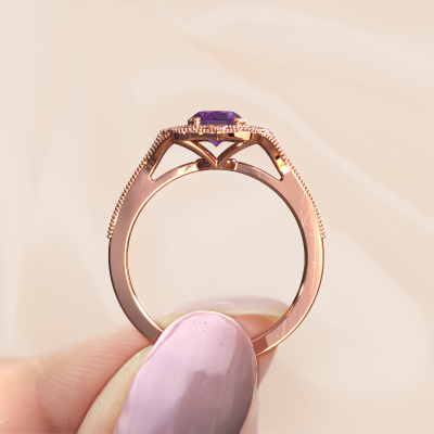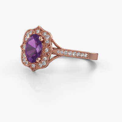 Dieser Verlobungsring aus 14 Karat Roségold heißt Loni. Dieser filigrane Roségold Verlobungsring mit 7,5x5,5 mm Amethyst ist ein wahres Kunstwerk! Ein wunderschön geschmücktes Design aus komplizierten Drähten. Mit Hingabe, Geduld und äußerster Präzision werden unsere erfahrenen Juweliere einen Ring nur für Sie entwerfen. Die Verzierungen mit kleinen Drähten werden von Hand in Perfektion gefertigt. Das ist ein langwieriger Prozess, der Schweißen, Werkzeug und Polieren umfasst, bis der erfahrene Juwelier mit dem Ergebnis zufrieden ist: Ein perfekter, auffälliger Ring, der ihn mit Freude zum Strahlen bringt. Deshalb ist der Vintage, filigrane Verlobungsring ein außergewöhnliches Geschenk, um die Liebe Ihres Lebens zu verwöhnen. Ein handgemachter, einzigartiger und personalisierter Ring, den man jemandem in diesem besonderen Moment geben kann, wenn man die eine Frage stellt. Ist das nicht wunderbar? Jedes Schmuckstück wird hergestellt mit Leidenschaft und Liebe, von einem unserer Meister-Goldschmiede.Da wir unsere eigenen Ringe entwerfen und liefern, können wir Ihnen einen Verlobungsring zu einem Preis anbieten, den Sie nirgendwo anders finden. Ein Ring wird auf Bestellung angefertigt, wodurch kein überschüssiges Material anfällt. So können wir Ihnen ein gutes Angebot zum besten Preis machen. Wir verstehen, dass es sich riskant anfühlt, Ihren Verlobungsring online zu kaufen. Jedoch helfen wir Ihnen gerne beim Designprozess unter Berücksichtigung Ihres Budgets.Unser Team fügt unserer Online-Kollektion täglich neue Designs hinzu. Unsere Designer und Goldschmiede arbeiten zusammen, um das beste Design zu kreieren. Wir bemühen uns, eine vielfältige Kollektion von Schmuckstücken anzubieten. Vielleicht haben Sie ein bestimmtes Design im Sinn. Eines, dass Sie irgendwo gesehen haben. Gerne geben wir Ihnen eine kostenlose Beratung. Wir machen Ihnen ein Angebot, basierend auf einem fairen Preis/Leistungsverhältnis, das Sie verblüffen wird.Um es einfacher zu machen, bieten wir eine kostenlose 30-tägige Rücksendung.