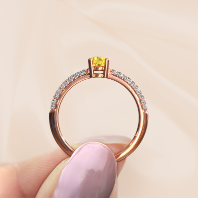Der oben gezeigte Verlobungsring wird Marjan genannt. Wir nennen das einen Ring mit Pavé-Fassung. Die kleineren Steine des Rings befinden sich in einer geschlossenen Reihe, die für zusätzlichen Glanz sorgt. Dieser Ring aus 14 Karat Roségold ist besetzt mit Gelb Saphir 4.2 mm. Welche Emotion möchten Sie vermitteln, wenn Sie für sie auf die Knie gehen? Dieser Roségold Verlobungsring ist mit atemberaubenden Gelb Saphir besetzt, um Ihre ewige Liebe zu repräsentieren. Die Edelsteine werden sorgfältig von Hand ausgewählt und präzise von unserem erfahrenen Goldschmieden gesetzt. Die eindeutige Lichtreflexion auf dem Ring kann nur erfasst werden, wenn die Gelb Saphir in perfekter Reihe stehen. Beim kunstvollen Schweißen und Polieren des Schmuckstücks wird der Lichteinfall ständig überwacht, bis der erfahrene Juwelier mit dem Ergebnis zufrieden ist. Ein Ring, der nur für Sie entworfen wurde, um Ihre Liebste so hell wie einen Gelb Saphir erstrahlen zu lassen. Weil es nur eine spezielle Person gibt, die einen so einzigartigen Ring tragen kann! Mit diesem bedeutungsvollen Kunstwerk, dem Symbol der Unendlichkeit, beweisen Sie Ihre unsterbliche Liebe zu ihr und dass Sie den Rest Ihres Lebens mit niemand anderem teilen wollen. Wie kann sie da widerstehen? Jedes Schmuckstück wird nur für Sie persönlich hergestellt, mit Liebe zum Detail und Design.Mit unserer modernen Technik können wir Schmuckstücke von höchster Qualität mit größter Sorgfalt für Sie entwerfen und anpassen. Unsere Verlobungsringe sind immer um 30 Prozent günstiger als bei anderen Juwelieren. Wir fertigen Verlobungsringe auf Bestellung, also müssen wir keine großen Lager unterhalten. Wenn Sie ein bestimmtes Budget haben, beraten wir Sie gerne entsprechend.Haben Sie irgendwo einen bestimmten Verlobungsring gefunden, den Sie Ihrem Liebsten schenken möchten? Sie können uns gerne sagen, was Sie wollen und wir werden Ihr Design in einen Einzigartigen exklusive Verlobungsring verwandeln. Sie können die Entwicklungen Ihres Ringdesigns verfolgen, da wir 3D-Zeichnungen verwenden. Das gibt Ihnen eine realistische Vorschau, wie Ihr Design aussehen wird. Sie können auch einen Dummy vorbestellen. Ein Dummy ist ein Kunststoffring, der nach Ihrem Ringdesign gestaltet werden kann. Sie können ihn anprobieren und prüfen, ob seine Breite und Größe für Sie geeignet sind. Wir senden Ihnen gerne ein unverbindliches Angebot zu einem fairen Preis/Leistungsverhältnis. Sie werden in Anbetracht der Qualität des Rings und der Edelsteine überrascht sein.Um es einfacher zu machen, bieten wir eine kostenlose 30-tägige Rücksendung.
