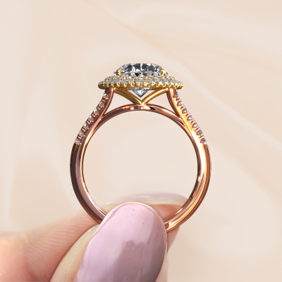 Der oben gezeigte Verlobungsring wird Elvie genannt. Es ist ein Halo Ring, da er einen zentralen Edelstein und ein Band mit Pavé-Fassung hat. Der 14 Karat Roségold ring ist mit einem 2.70 crt oval Lab-grown Diamant-Mittelstein besetzt und um ihn herum eine Pavé-Fassung mit Lab grown Diamant. Was diesen Vintage, Roségold Pavé Solitär Ring besonders macht, sind die kleineren Steine, die den zentralen Stein umschließen. Dieser wunderschöne Verlobungsring wird als Pavé Solitär Ring bezeichnet, da die kleineren Edelsteine dem zentralen Stein einen Lichthof geben. Damit die kleineren Steine den Mittelstein verstärken, müssen sie so platziert werden, dass keine Lichteinflüsse auftreten. Und hier kommen unsere erfahrenen Goldschmiede ins Spiel. Jeder einzelne Stein wird sorgfältig von Hand in den Ring gesetzt. Während der Herstellung wird der Lichteinfall ständig überprüft. So können wir sicherstellen, dass der spezielle Lichtkranz noch sichtbar ist. Am Ende erhalten Sie einen einzigartigen Verlobungsring mit einem Lab grown Diamant Ihrer Wahl in der Mitte. Sie können sich die Wirkung eines solchen Ringes vorstellen, wenn Sie ihn an ihrem besonderen Tag für sie zum Leuchten bringen. Mit unserer modernen Technik können wir Schmuckstücke von höchster Qualität mit größter Sorgfalt für Sie entwerfen und anpassen. Unsere Verlobungsringe sind immer um 30 Prozent günstiger als bei anderen Juwelieren. Wir fertigen Verlobungsringe auf Bestellung, also müssen wir keine großen Lager unterhalten. Wenn Sie ein bestimmtes Budget haben, beraten wir Sie gerne entsprechend.Haben Sie einen bestimmten Ring im Sinn? Eines, dass Sie irgendwo gesehen haben. Bitte zögern Sie nicht, uns zu sagen, was Sie wollen und wir werden Ihr Design in einen Einzigartigen Verlobungsring verwandeln. Sie können die Entwicklungen Ihres Ringdesigns verfolgen, da wir 3D-Zeichnungen verwenden. Das gibt Ihnen eine realistische Vorschau Ihres Designs. Wir senden Ihnen gerne ein unverbindliches Angebot zu einem fairen Preis/Leistungsverhältnis. Es wird Sie erstaunen.Um es einfacher zu machen, bieten wir eine kostenlose 30-tägige Rücksendung.