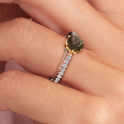 Dieser Verlobungsring aus 14 Karat Roségold heißt Venita und hat einen Rauchquarz Edelstein. Ein außergewöhnlicher, Roségold Vintage Ring. Einer, der die Liebe Ihres Lebens mit Sicherheit wie ein Rauchquarz erstrahlen lässt! Das hoffen wir zu erreichen. Dieser Vintage Verlobungsring ist mit exquisiten Rauchquarz besetzt. Welchen Edelstein Sie aus unserer Auswahl haben möchten, liegt ganz bei Ihnen. Der Edelstein wird mit großer Sorgfalt ausgewählt. Denn wir glauben, dass Ihr Verlobungsring nur mit dem schönsten Edelstein gekrönt sein darf. Sehen Sie das auch so? Unser erfahrener Juwelier entwirft Ihren Ring in unserem eigenen Studio, wo der Rauchquarz mit großer Präzision eingefasst wird. Der Ring wird dann bearbeitet und poliert, bis er perfekt ist. Nichts als das Beste für die Liebe Ihres Lebens! Jedes Schmuckstück wird von unseren Meister-Goldschmieden in unserem eigenen Studio für Sie gefertigt.Nach Erhalt Ihrer Bestellung beginnen unsere Goldschmiede mit Leidenschaft den kreativen Prozess und fertigen Ihren Verlobungsring in unserem eigenen Studio. Da wir keine großen Lager haben, werden diese Kosten nicht an Sie weitergegeben. Unsere Preisgestaltung ist der Beweis dafür! Wir bieten Schmuck zum niedrigsten Preis, garantiert.Unser Team fügt unserer Online-Kollektion täglich neue Designs hinzu. Unsere Designer und Goldschmiede arbeiten zusammen, um das beste Design zu kreieren. Wir bemühen uns, eine vielfältige Kollektion von Schmuckstücken anzubieten. Vielleicht haben Sie ein bestimmtes Design im Sinn. Eines, dass Sie irgendwo gesehen haben. Gerne geben wir Ihnen eine kostenlose Beratung. Wir machen Ihnen ein Angebot, basierend auf einem fairen Preis/Leistungsverhältnis, das Sie verblüffen wird.Um es einfacher zu machen, bieten wir eine kostenlose 30-tägige Rücksendung.