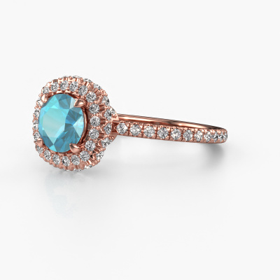 Der oben gezeigte Verlobungsring wird Talitha RND genannt. Es ist ein Halo Ring, da er einen zentralen Edelstein und ein Band mit Pavé-Fassung hat. Der 14 Karat Roségold ring ist mit einem 6.5 mm rund Blau Topas-Mittelstein besetzt und um ihn herum eine Pavé-Fassung mit Lab grown Diamant. Was diesen exklusive, Roségold Halo Ring besonders macht, sind die kleineren Steine, die den zentralen Stein umschließen. Dieser wunderschöne Verlobungsring wird als Halo Ring bezeichnet, da die kleineren Edelsteine dem zentralen Stein einen Lichthof geben. Damit die kleineren Steine den Mittelstein verstärken, müssen sie so platziert werden, dass keine Lichteinflüsse auftreten. Und hier kommen unsere erfahrenen Goldschmiede ins Spiel. Jeder einzelne Stein wird sorgfältig von Hand in den Ring gesetzt. Während der Herstellung wird der Lichteinfall ständig überprüft. So können wir sicherstellen, dass der spezielle Lichtkranz noch sichtbar ist. Am Ende erhalten Sie einen einzigartigen Verlobungsring mit einem Blaue Topas Ihrer Wahl in der Mitte. Sie können sich die Wirkung eines solchen Ringes vorstellen, wenn Sie ihn an ihrem besonderen Tag für sie zum Leuchten bringen. Haben Sie ein bestimmtes Budget? Sie können uns gerne kontaktieren, damit wir Ihre Optionen besprechen können. Wir bieten unsere Verlobungsringe zum garantiert besten Preis, denn wir fertigen sie auf Bestellung. Solche Preise finden Sie nirgendwo anders!Unser Team fügt unserer Online-Kollektion täglich neue Designs hinzu. Unsere Designer und Goldschmiede arbeiten zusammen, um das beste Design zu kreieren. Wir bemühen uns, eine vielfältige Kollektion von Schmuckstücken anzubieten. Vielleicht haben Sie ein bestimmtes Design im Sinn. Eines, dass Sie irgendwo gesehen haben. Gerne geben wir Ihnen eine kostenlose Beratung. Wir machen Ihnen ein Angebot, basierend auf einem fairen Preis/Leistungsverhältnis, das Sie verblüffen wird.Um es einfacher zu machen, bieten wir eine kostenlose 30-tägige Rücksendung.
