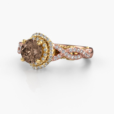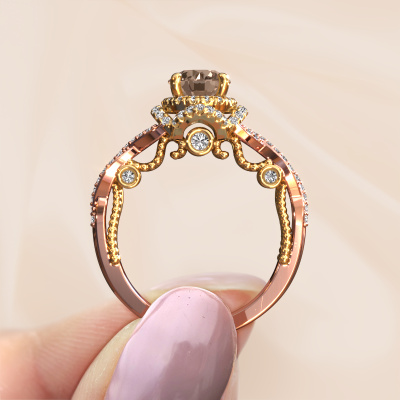 Der oben gezeigte Verlobungsring wird Leora genannt. Es ist ein Halo Ring, da er einen zentralen Edelstein und ein Band mit Pavé-Fassung hat. Der 14 Karat Roségold ring ist mit einem 1.00 crt rund Braun Diamant-Mittelstein besetzt und um ihn herum eine Pavé-Fassung mit Lab grown Diamant. Was diesen Vintage, Roségold Halo Ring besonders macht, sind die kleineren Steine, die den zentralen Stein umschließen. Dieser wunderschöne Verlobungsring wird als Halo Ring bezeichnet, da die kleineren Edelsteine dem zentralen Stein einen Lichthof geben. Damit die kleineren Steine den Mittelstein verstärken, müssen sie so platziert werden, dass keine Lichteinflüsse auftreten. Und hier kommen unsere erfahrenen Goldschmiede ins Spiel. Jeder einzelne Stein wird sorgfältig von Hand in den Ring gesetzt. Während der Herstellung wird der Lichteinfall ständig überprüft. So können wir sicherstellen, dass der spezielle Lichtkranz noch sichtbar ist. Am Ende erhalten Sie einen einzigartigen Verlobungsring mit einem Braune Diamanten Ihrer Wahl in der Mitte. Sie können sich die Wirkung eines solchen Ringes vorstellen, wenn Sie ihn an ihrem besonderen Tag für sie zum Leuchten bringen. Mit unserer modernen Technik können wir Schmuckstücke von höchster Qualität mit größter Sorgfalt für Sie entwerfen und anpassen. Unsere Verlobungsringe sind immer um 30 Prozent günstiger als bei anderen Juwelieren. Wir fertigen Verlobungsringe auf Bestellung, also müssen wir keine großen Lager unterhalten. Wenn Sie ein bestimmtes Budget haben, beraten wir Sie gerne entsprechend.Unsere Designer und Goldschmiede arbeiten jeden Tag zusammen und versuchen, neue Schmuckstücke zu kreieren. Vielleicht haben Sie irgendwo einen schönen, Vintage Verlobungsring gefunden, nach dem Ihr einzigartiger Ring gestaltet werden kann. Setzen Sie sich mit uns in Verbindung. Wir machen Ihnen ein Angebot, basierend auf einem fairen Preis/Leistungsverhältnis, das Sie begeistern wird.Um es einfacher zu machen, bieten wir eine kostenlose 30-tägige Rücksendung.
