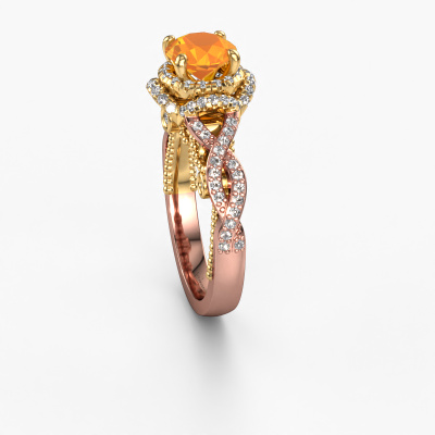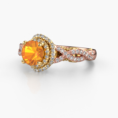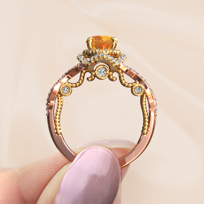 Der oben gezeigte Verlobungsring wird Leora genannt. Es ist ein Halo Ring, da er einen zentralen Edelstein und ein Band mit Pavé-Fassung hat. Der 14 Karat Roségold ring ist mit einem 6.5 mm rund Citrin-Mittelstein besetzt und um ihn herum eine Pavé-Fassung mit Lab grown Diamant. Was diesen Vintage, Roségold Halo Ring besonders macht, sind die kleineren Steine, die den zentralen Stein umschließen. Dieser wunderschöne Verlobungsring wird als Halo Ring bezeichnet, da die kleineren Edelsteine dem zentralen Stein einen Lichthof geben. Damit die kleineren Steine den Mittelstein verstärken, müssen sie so platziert werden, dass keine Lichteinflüsse auftreten. Und hier kommen unsere erfahrenen Goldschmiede ins Spiel. Jeder einzelne Stein wird sorgfältig von Hand in den Ring gesetzt. Während der Herstellung wird der Lichteinfall ständig überprüft. So können wir sicherstellen, dass der spezielle Lichtkranz noch sichtbar ist. Am Ende erhalten Sie einen einzigartigen Verlobungsring mit einem Citrin Ihrer Wahl in der Mitte. Sie können sich die Wirkung eines solchen Ringes vorstellen, wenn Sie ihn an ihrem besonderen Tag für sie zum Leuchten bringen. Mit unserer modernen Technik können wir Schmuckstücke von höchster Qualität mit größter Sorgfalt für Sie entwerfen und anpassen. Unsere Verlobungsringe sind immer um 30 Prozent günstiger als bei anderen Juwelieren. Wir fertigen Verlobungsringe auf Bestellung, also müssen wir keine großen Lager unterhalten. Wenn Sie ein bestimmtes Budget haben, beraten wir Sie gerne entsprechend.Unsere Designer und Goldschmiede arbeiten jeden Tag zusammen und versuchen, neue Schmuckstücke zu kreieren. Vielleicht haben Sie irgendwo einen schönen, Vintage Verlobungsring gefunden, nach dem Ihr einzigartiger Ring gestaltet werden kann. Setzen Sie sich mit uns in Verbindung. Wir machen Ihnen ein Angebot, basierend auf einem fairen Preis/Leistungsverhältnis, das Sie begeistern wird.Um es einfacher zu machen, bieten wir eine kostenlose 30-tägige Rücksendung.