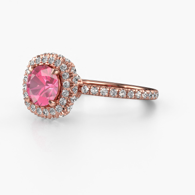 Der oben gezeigte Verlobungsring wird Talitha RND genannt. Es ist ein Halo Ring, da er einen zentralen Edelstein und ein Band mit Pavé-Fassung hat. Der 14 Karat Roségold ring ist mit einem 6.5 mm rund Pink Saphir-Mittelstein besetzt und um ihn herum eine Pavé-Fassung mit Lab grown Diamant. Was diesen exklusive, Roségold Halo Ring besonders macht, sind die kleineren Steine, die den zentralen Stein umschließen. Dieser wunderschöne Verlobungsring wird als Halo Ring bezeichnet, da die kleineren Edelsteine dem zentralen Stein einen Lichthof geben. Damit die kleineren Steine den Mittelstein verstärken, müssen sie so platziert werden, dass keine Lichteinflüsse auftreten. Und hier kommen unsere erfahrenen Goldschmiede ins Spiel. Jeder einzelne Stein wird sorgfältig von Hand in den Ring gesetzt. Während der Herstellung wird der Lichteinfall ständig überprüft. So können wir sicherstellen, dass der spezielle Lichtkranz noch sichtbar ist. Am Ende erhalten Sie einen einzigartigen Verlobungsring mit einem Pink Saphir Ihrer Wahl in der Mitte. Sie können sich die Wirkung eines solchen Ringes vorstellen, wenn Sie ihn an ihrem besonderen Tag für sie zum Leuchten bringen. Haben Sie ein bestimmtes Budget? Sie können uns gerne kontaktieren, damit wir Ihre Optionen besprechen können. Wir bieten unsere Verlobungsringe zum garantiert besten Preis, denn wir fertigen sie auf Bestellung. Solche Preise finden Sie nirgendwo anders!Unser Team fügt unserer Online-Kollektion täglich neue Designs hinzu. Unsere Designer und Goldschmiede arbeiten zusammen, um das beste Design zu kreieren. Wir bemühen uns, eine vielfältige Kollektion von Schmuckstücken anzubieten. Vielleicht haben Sie ein bestimmtes Design im Sinn. Eines, dass Sie irgendwo gesehen haben. Gerne geben wir Ihnen eine kostenlose Beratung. Wir machen Ihnen ein Angebot, basierend auf einem fairen Preis/Leistungsverhältnis, das Sie verblüffen wird.Um es einfacher zu machen, bieten wir eine kostenlose 30-tägige Rücksendung.