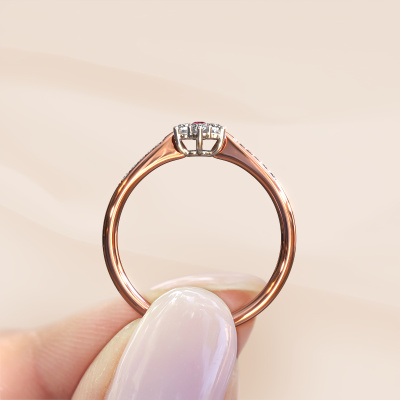 Der oben gezeigte Ring wird Chantal 2 genannt. Ein Cluster Ring mit einem zentralen Edelstein, umgeben von kleineren Steinen, wir nennen das einen Cluster Ring. Diese Version in 14 Karat Roségold hat einen 1.7 mm rund Rubin als Mittelstein, umschlossen von kleineren Lab grown Diamant. Wenn Sie einen Roségold Cluster Verlobungsring sehen, werden Sie vielleicht den Eindruck bekommen, dass seine kleineren Steine mit dem größeren Rubin aufeinanderprallen. Deshalb ist er wie eine Blume geformt. Deshalb ist dieser Verlobungsring auch als Blumen- oder Rosetten Fassung bekannt. Es ist sehr wichtig, dass die kleineren Lab grown Diamant identisch positioniert sind, so dass es kein Spiel im Licht, sondern eine perfekte Einheit ergibt. Unsere erfahrenen Juweliere erledigen diese Arbeit. Jeder einzelne Stein wird sorgfältig von Hand gesetzt. Während der Herstellung wird der Lichteinfall ständig überwacht. Am Ende bekommen Sie den perfekten Verlobungsring mit einem strahlenden Rubin Edelstein Herzstück. Sie können sich die Wirkung eines solchen Ringes vorstellen, wenn Sie ihn an ihrem besonderen Tag für die Liebe Ihres Lebens zum Leuchten bringen. Nach Erhalt Ihrer Bestellung beginnen unsere Goldschmiede mit Leidenschaft den kreativen Prozess und fertigen Ihren Verlobungsring in unserem eigenen Studio. Da wir keine großen Lager haben, werden diese Kosten nicht an Sie weitergegeben. Unsere Preisgestaltung ist der Beweis dafür! Wir bieten Schmuck zum niedrigsten Preis, garantiert.Haben Sie irgendwo einen bestimmten Verlobungsring gefunden, den Sie Ihrem Liebsten schenken möchten? Sie können uns gerne sagen, was Sie wollen und wir werden Ihr Design in einen Einzigartigen traditionell Verlobungsring verwandeln. Sie können die Entwicklungen Ihres Ringdesigns verfolgen, da wir 3D-Zeichnungen verwenden. Das gibt Ihnen eine realistische Vorschau, wie Ihr Design aussehen wird. Sie können auch einen Dummy vorbestellen. Ein Dummy ist ein Kunststoffring, der nach Ihrem Ringdesign gestaltet werden kann. Sie können ihn anprobieren und prüfen, ob seine Breite und Größe für Sie geeignet sind. Wir senden Ihnen gerne ein unverbindliches Angebot zu einem fairen Preis/Leistungsverhältnis. Sie werden in Anbetracht der Qualität des Rings und der Edelsteine überrascht sein.Um es einfacher zu machen, bieten wir eine kostenlose 30-tägige Rücksendung.