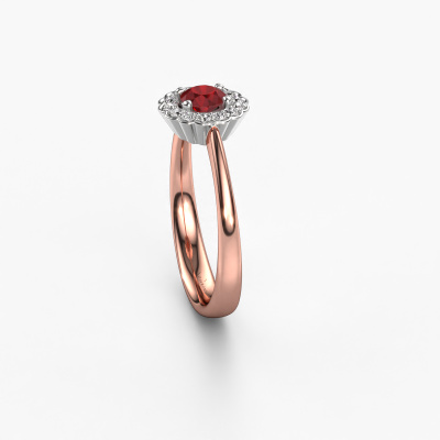 Der oben gezeigte Verlobungsring wird Debi genannt. Es ist ein Halo Ring, da er einen zentralen Edelstein und ein Band mit Pavé-Fassung hat. Der 14 Karat Roségold ring ist mit einem 4.2 mm rund Rubin-Mittelstein besetzt und um ihn herum eine Pavé-Fassung mit Diamanten. Was diesen klassische, Roségold Halo Ring besonders macht, sind die kleineren Steine, die den zentralen Stein umschließen. Dieser wunderschöne Verlobungsring wird als Halo Ring bezeichnet, da die kleineren Edelsteine dem zentralen Stein einen Lichthof geben. Damit die kleineren Steine den Mittelstein verstärken, müssen sie so platziert werden, dass keine Lichteinflüsse auftreten. Und hier kommen unsere erfahrenen Goldschmiede ins Spiel. Jeder einzelne Stein wird sorgfältig von Hand in den Ring gesetzt. Während der Herstellung wird der Lichteinfall ständig überprüft. So können wir sicherstellen, dass der spezielle Lichtkranz noch sichtbar ist. Am Ende erhalten Sie einen einzigartigen Verlobungsring mit einem Rubin Ihrer Wahl in der Mitte. Sie können sich die Wirkung eines solchen Ringes vorstellen, wenn Sie ihn an ihrem besonderen Tag für sie zum Leuchten bringen. Da wir unsere eigenen Ringe entwerfen und liefern, können wir Ihnen einen Verlobungsring zu einem Preis anbieten, den Sie nirgendwo anders finden. Ein Ring wird auf Bestellung angefertigt, wodurch kein überschüssiges Material anfällt. So können wir Ihnen ein gutes Angebot zum besten Preis machen. Wir verstehen, dass es sich riskant anfühlt, Ihren Verlobungsring online zu kaufen. Jedoch helfen wir Ihnen gerne beim Designprozess unter Berücksichtigung Ihres Budgets.Unser Team fügt unserer Online-Kollektion täglich neue Designs hinzu. Unsere Designer und Goldschmiede arbeiten zusammen, um das beste Design zu kreieren. Wir bemühen uns, eine vielfältige Kollektion von Schmuckstücken anzubieten. Vielleicht haben Sie ein bestimmtes Design im Sinn. Eines, dass Sie irgendwo gesehen haben. Gerne geben wir Ihnen eine kostenlose Beratung. Wir machen Ihnen ein Angebot, basierend auf einem fairen Preis/Leistungsverhältnis, das Sie verblüffen wird.Um es einfacher zu machen, bieten wir eine kostenlose 30-tägige Rücksendung.