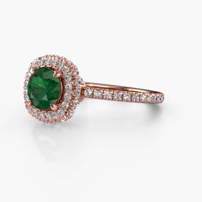 Der oben gezeigte Verlobungsring wird Talitha RND genannt. Es ist ein Halo Ring, da er einen zentralen Edelstein und ein Band mit Pavé-Fassung hat. Der 14 Karat Roségold ring ist mit einem 6.5 mm rund Smaragd-Mittelstein besetzt und um ihn herum eine Pavé-Fassung mit Lab grown Diamant. Was diesen exklusive, Roségold Halo Ring besonders macht, sind die kleineren Steine, die den zentralen Stein umschließen. Dieser wunderschöne Verlobungsring wird als Halo Ring bezeichnet, da die kleineren Edelsteine dem zentralen Stein einen Lichthof geben. Damit die kleineren Steine den Mittelstein verstärken, müssen sie so platziert werden, dass keine Lichteinflüsse auftreten. Und hier kommen unsere erfahrenen Goldschmiede ins Spiel. Jeder einzelne Stein wird sorgfältig von Hand in den Ring gesetzt. Während der Herstellung wird der Lichteinfall ständig überprüft. So können wir sicherstellen, dass der spezielle Lichtkranz noch sichtbar ist. Am Ende erhalten Sie einen einzigartigen Verlobungsring mit einem Smaragd Ihrer Wahl in der Mitte. Sie können sich die Wirkung eines solchen Ringes vorstellen, wenn Sie ihn an ihrem besonderen Tag für sie zum Leuchten bringen. Haben Sie ein bestimmtes Budget? Sie können uns gerne kontaktieren, damit wir Ihre Optionen besprechen können. Wir bieten unsere Verlobungsringe zum garantiert besten Preis, denn wir fertigen sie auf Bestellung. Solche Preise finden Sie nirgendwo anders!Unser Team fügt unserer Online-Kollektion täglich neue Designs hinzu. Unsere Designer und Goldschmiede arbeiten zusammen, um das beste Design zu kreieren. Wir bemühen uns, eine vielfältige Kollektion von Schmuckstücken anzubieten. Vielleicht haben Sie ein bestimmtes Design im Sinn. Eines, dass Sie irgendwo gesehen haben. Gerne geben wir Ihnen eine kostenlose Beratung. Wir machen Ihnen ein Angebot, basierend auf einem fairen Preis/Leistungsverhältnis, das Sie verblüffen wird.Um es einfacher zu machen, bieten wir eine kostenlose 30-tägige Rücksendung.