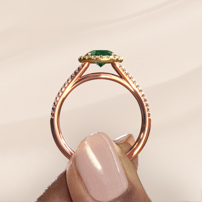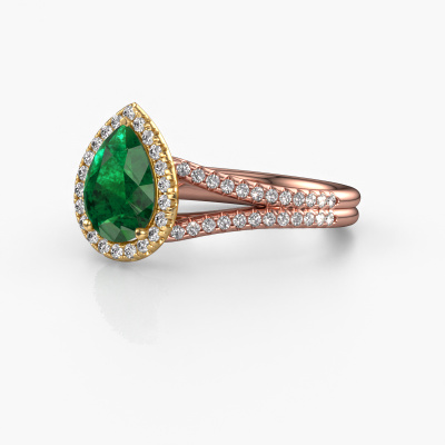 Der oben gezeigte Verlobungsring wird Verla pear 2 genannt. Es ist ein Halo Ring, da er einen zentralen Edelstein und ein Band mit Pavé-Fassung hat. Der 14 Karat Roségold ring ist mit einem 8x6 mm tropfen Smaragd-Mittelstein besetzt und um ihn herum eine Pavé-Fassung mit Diamanten. Was diesen exklusive, Roségold Halo Ring besonders macht, sind die kleineren Steine, die den zentralen Stein umschließen. Dieser wunderschöne Verlobungsring wird als Halo Ring bezeichnet, da die kleineren Edelsteine dem zentralen Stein einen Lichthof geben. Damit die kleineren Steine den Mittelstein verstärken, müssen sie so platziert werden, dass keine Lichteinflüsse auftreten. Und hier kommen unsere erfahrenen Goldschmiede ins Spiel. Jeder einzelne Stein wird sorgfältig von Hand in den Ring gesetzt. Während der Herstellung wird der Lichteinfall ständig überprüft. So können wir sicherstellen, dass der spezielle Lichtkranz noch sichtbar ist. Am Ende erhalten Sie einen einzigartigen Verlobungsring mit einem Smaragd Ihrer Wahl in der Mitte. Sie können sich die Wirkung eines solchen Ringes vorstellen, wenn Sie ihn an ihrem besonderen Tag für sie zum Leuchten bringen. Nach Erhalt Ihrer Bestellung beginnen unsere Goldschmiede mit Leidenschaft den kreativen Prozess und fertigen Ihren Verlobungsring in unserem eigenen Studio. Da wir keine großen Lager haben, werden diese Kosten nicht an Sie weitergegeben. Unsere Preisgestaltung ist der Beweis dafür! Wir bieten Schmuck zum niedrigsten Preis, garantiert.Unsere Designer und Goldschmiede arbeiten jeden Tag zusammen und versuchen, neue Schmuckstücke zu kreieren. Vielleicht haben Sie irgendwo einen schönen, exklusive Verlobungsring gefunden, nach dem Ihr einzigartiger Ring gestaltet werden kann. Setzen Sie sich mit uns in Verbindung. Wir machen Ihnen ein Angebot, basierend auf einem fairen Preis/Leistungsverhältnis, das Sie begeistern wird.Um es einfacher zu machen, bieten wir eine kostenlose 30-tägige Rücksendung.