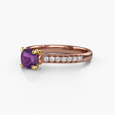 Der oben gezeigte Roségold Verlobungsring wird Valorie cus 2 genannt. Es ist ein Pavé Solitär Ring, da er einen zentralen Edelstein und ein Band mit Pavé-Fassung hat. Der traditionell Pavé Solitär Verlobungsring ist in der Kombination 14 Karat Roségold mit Gold und ist mit einem cussion 5.5 mm Amethyst-Mittelstein besetzt und das Band hat eine Pavé-Fassung mit Diamanten. Jedes Schmuckstück wird von unseren Meister-Goldschmieden in unserem eigenen Studio für Sie gefertigt. Um den zentralen Stein noch mehr zu betonen, hat das Band eine Pavé-Fassung mit weiteren Amethyst. Durch die offenen Krappen kann das Licht aus mehreren Winkeln auf den Amethyst treffen und der Amethyst-Ring funkelt noch mehr. Das obere Foto zeigt die leidenschaftlich handgefertigten Details des Rings. Die hohe Positionierung der Mittelstein ist ein echter Blickfang. Der perfekte Verlobungsring für das Kronjuwel Ihres Lebens!Durch die Kombination modernster Technik mit uralter Handwerkskunst können wir alle Verlobungsringe in unserem eigenen Studio anfertigen. Jedes Schmuckstück wird auf Anfrage gefertigt. Das ist vorteilhaft, weil wir Ihnen dadurch einen Preis anbieten können, den Sie nirgendwo anders finden.Unsere Designer und Goldschmiede arbeiten jeden Tag zusammen und versuchen, neue Schmuckstücke zu kreieren. Vielleicht haben Sie irgendwo einen schönen, traditionell Verlobungsring gefunden, nach dem Ihr einzigartiger Ring gestaltet werden kann. Setzen Sie sich mit uns in Verbindung. Wir machen Ihnen ein Angebot, basierend auf einem fairen Preis/Leistungsverhältnis, das Sie begeistern wird.Um es einfacher zu machen, bieten wir eine kostenlose 30-tägige Rücksendung.