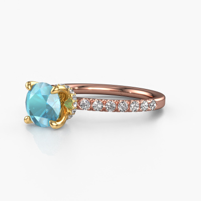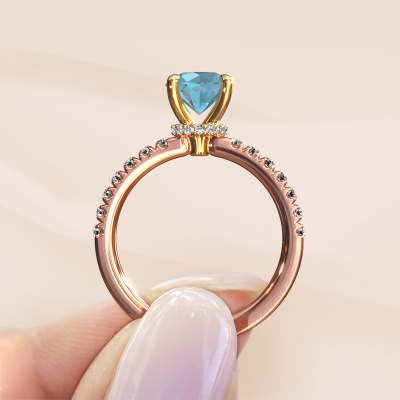 Der oben gezeigte Roségold Verlobungsring wird Crystal rnd 4 genannt. Es ist ein Pavé Solitär Ring, da er einen zentralen Edelstein und ein Band mit Pavé-Fassung hat. Der Fantasie Pavé Solitär Verlobungsring ist in der Kombination 14 Karat Roségold mit Gold und ist mit einem rund 7 mm Blau Topas-Mittelstein besetzt und das Band hat eine Pavé-Fassung mit Lab grown Diamant. Jedes Schmuckstück lässt Ihren Finger erstrahlen. Ihr Ring ist mit Liebe von unseren Goldschmieden handgefertigt. Um den zentralen Stein noch mehr zu betonen, hat das Band eine Pavé-Fassung mit weiteren Blau Topas. Durch die offenen Krappen kann das Licht aus mehreren Winkeln auf den Blau Topas treffen und der Blau Topas-Ring funkelt noch mehr. Das obere Foto zeigt die leidenschaftlich handgefertigten Details des Rings. Die hohe Positionierung der Mittelstein ist ein echter Blickfang. Der perfekte Verlobungsring für das Kronjuwel Ihres Lebens!Mit unserer modernen Technik können wir Schmuckstücke von höchster Qualität mit größter Sorgfalt für Sie entwerfen und anpassen. Unsere Verlobungsringe sind immer um 30 Prozent günstiger als bei anderen Juwelieren. Wir fertigen Verlobungsringe auf Bestellung, also müssen wir keine großen Lager unterhalten. Wenn Sie ein bestimmtes Budget haben, beraten wir Sie gerne entsprechend.Haben Sie irgendwo einen bestimmten Verlobungsring gefunden, den Sie Ihrem Liebsten schenken möchten? Sie können uns gerne sagen, was Sie wollen und wir werden Ihr Design in einen Einzigartigen Fantasie Verlobungsring verwandeln. Sie können die Entwicklungen Ihres Ringdesigns verfolgen, da wir 3D-Zeichnungen verwenden. Das gibt Ihnen eine realistische Vorschau, wie Ihr Design aussehen wird. Sie können auch einen Dummy vorbestellen. Ein Dummy ist ein Kunststoffring, der nach Ihrem Ringdesign gestaltet werden kann. Sie können ihn anprobieren und prüfen, ob seine Breite und Größe für Sie geeignet sind. Wir senden Ihnen gerne ein unverbindliches Angebot zu einem fairen Preis/Leistungsverhältnis. Sie werden in Anbetracht der Qualität des Rings und der Edelsteine überrascht sein.Um es einfacher zu machen, bieten wir eine kostenlose 30-tägige Rücksendung.