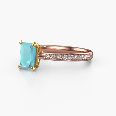 Der oben gezeigte Roségold Verlobungsring wird Mignon eme 2 genannt. Es ist ein Pavé Solitär Ring, da er einen zentralen Edelstein und ein Band mit Pavé-Fassung hat. Der exklusive Pavé Solitär Verlobungsring ist in der Kombination 14 Karat Roségold mit Gold und ist mit einem smaragd schliff 7x5 mm Blau Topas-Mittelstein besetzt und das Band hat eine Pavé-Fassung mit Lab grown Diamant. Jedes Schmuckstück wird nur für Sie persönlich hergestellt, mit Liebe zum Detail und Design. Um den zentralen Stein noch mehr zu betonen, hat das Band eine Pavé-Fassung mit weiteren Blau Topas. Durch die offenen Krappen kann das Licht aus mehreren Winkeln auf den Blau Topas treffen und der Blau Topas-Ring funkelt noch mehr. Das obere Foto zeigt die leidenschaftlich handgefertigten Details des Rings. Die hohe Positionierung der Mittelstein ist ein echter Blickfang. Der perfekte Verlobungsring für das Kronjuwel Ihres Lebens!Haben Sie ein bestimmtes Budget? Sie können uns gerne kontaktieren, damit wir Ihre Optionen besprechen können. Wir bieten unsere Verlobungsringe zum garantiert besten Preis, denn wir fertigen sie auf Bestellung. Solche Preise finden Sie nirgendwo anders!Haben Sie einen bestimmten Ring im Sinn? Eines, dass Sie irgendwo gesehen haben. Bitte zögern Sie nicht, uns zu sagen, was Sie wollen und wir werden Ihr Design in einen Einzigartigen Verlobungsring verwandeln. Sie können die Entwicklungen Ihres Ringdesigns verfolgen, da wir 3D-Zeichnungen verwenden. Das gibt Ihnen eine realistische Vorschau Ihres Designs. Wir senden Ihnen gerne ein unverbindliches Angebot zu einem fairen Preis/Leistungsverhältnis. Es wird Sie erstaunen.Um es einfacher zu machen, bieten wir eine kostenlose 30-tägige Rücksendung.