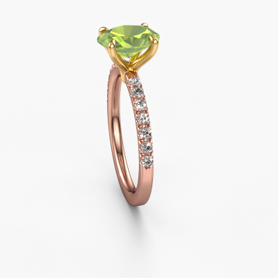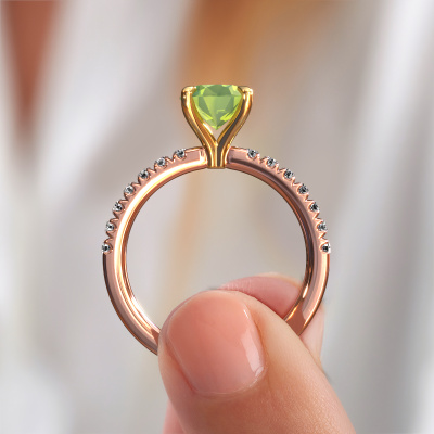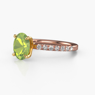 Der oben gezeigte Roségold Verlobungsring wird Crystal OVL 2 genannt. Es ist ein Pavé Solitär Ring, da er einen zentralen Edelstein und ein Band mit Pavé-Fassung hat. Der exklusive Pavé Solitär Verlobungsring ist in der Kombination 14 Karat Roségold mit Gold und ist mit einem oval 9x7 mm Peridot-Mittelstein besetzt und das Band hat eine Pavé-Fassung mit Lab grown Diamant. Jedes Schmuckstück wird von unseren Meister-Goldschmieden in unserem eigenen Studio für Sie gefertigt. Um den zentralen Stein noch mehr zu betonen, hat das Band eine Pavé-Fassung mit weiteren Peridot. Durch die offenen Krappen kann das Licht aus mehreren Winkeln auf den Peridot treffen und der Peridot-Ring funkelt noch mehr. Das obere Foto zeigt die leidenschaftlich handgefertigten Details des Rings. Die hohe Positionierung der Mittelstein ist ein echter Blickfang. Der perfekte Verlobungsring für das Kronjuwel Ihres Lebens!Durch die Kombination modernster Technik mit uralter Handwerkskunst können wir alle Verlobungsringe in unserem eigenen Studio anfertigen. Jedes Schmuckstück wird auf Anfrage gefertigt. Das ist vorteilhaft, weil wir Ihnen dadurch einen Preis anbieten können, den Sie nirgendwo anders finden.Unser Team fügt unserer Online-Kollektion täglich neue Designs hinzu. Unsere Designer und Goldschmiede arbeiten zusammen, um das beste Design zu kreieren. Wir bemühen uns, eine vielfältige Kollektion von Schmuckstücken anzubieten. Vielleicht haben Sie ein bestimmtes Design im Sinn. Eines, dass Sie irgendwo gesehen haben. Gerne geben wir Ihnen eine kostenlose Beratung. Wir machen Ihnen ein Angebot, basierend auf einem fairen Preis/Leistungsverhältnis, das Sie verblüffen wird.Um es einfacher zu machen, bieten wir eine kostenlose 30-tägige Rücksendung.