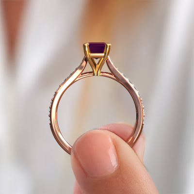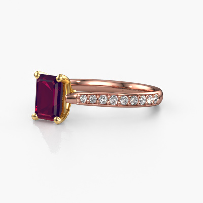 Der oben gezeigte Roségold Verlobungsring wird Mignon eme 2 genannt. Es ist ein Pavé Solitär Ring, da er einen zentralen Edelstein und ein Band mit Pavé-Fassung hat. Der exklusive Pavé Solitär Verlobungsring ist in der Kombination 14 Karat Roségold mit Gold und ist mit einem smaragd schliff 7x5 mm Rhodolit-Mittelstein besetzt und das Band hat eine Pavé-Fassung mit Lab grown Diamant. Jedes Schmuckstück wird nur für Sie persönlich hergestellt, mit Liebe zum Detail und Design. Um den zentralen Stein noch mehr zu betonen, hat das Band eine Pavé-Fassung mit weiteren Rhodolit. Durch die offenen Krappen kann das Licht aus mehreren Winkeln auf den Rhodolit treffen und der Rhodolit-Ring funkelt noch mehr. Das obere Foto zeigt die leidenschaftlich handgefertigten Details des Rings. Die hohe Positionierung der Mittelstein ist ein echter Blickfang. Der perfekte Verlobungsring für das Kronjuwel Ihres Lebens!Haben Sie ein bestimmtes Budget? Sie können uns gerne kontaktieren, damit wir Ihre Optionen besprechen können. Wir bieten unsere Verlobungsringe zum garantiert besten Preis, denn wir fertigen sie auf Bestellung. Solche Preise finden Sie nirgendwo anders!Haben Sie einen bestimmten Ring im Sinn? Eines, dass Sie irgendwo gesehen haben. Bitte zögern Sie nicht, uns zu sagen, was Sie wollen und wir werden Ihr Design in einen Einzigartigen Verlobungsring verwandeln. Sie können die Entwicklungen Ihres Ringdesigns verfolgen, da wir 3D-Zeichnungen verwenden. Das gibt Ihnen eine realistische Vorschau Ihres Designs. Wir senden Ihnen gerne ein unverbindliches Angebot zu einem fairen Preis/Leistungsverhältnis. Es wird Sie erstaunen.Um es einfacher zu machen, bieten wir eine kostenlose 30-tägige Rücksendung.