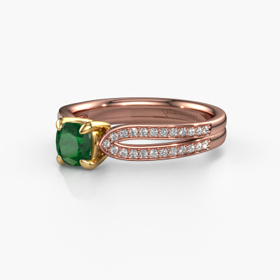 Der oben gezeigte Roségold Verlobungsring wird Antonia cus 2 genannt. Es ist ein Pavé Solitär Ring, da er einen zentralen Edelstein und ein Band mit Pavé-Fassung hat. Der Fantasie Pavé Solitär Verlobungsring ist in der Kombination 14 Karat Roségold mit Gold und ist mit einem cussion 5 mm Smaragd-Mittelstein besetzt und das Band hat eine Pavé-Fassung mit Lab grown Diamant. Jedes Schmuckstück wird von unseren Meister-Goldschmieden in unserem eigenen Studio für Sie gefertigt. Um den zentralen Stein noch mehr zu betonen, hat das Band eine Pavé-Fassung mit weiteren Smaragd. Durch die offenen Krappen kann das Licht aus mehreren Winkeln auf den Smaragd treffen und der Smaragd-Ring funkelt noch mehr. Das obere Foto zeigt die leidenschaftlich handgefertigten Details des Rings. Die hohe Positionierung der Mittelstein ist ein echter Blickfang. Der perfekte Verlobungsring für das Kronjuwel Ihres Lebens!Mit unserer modernen Technik können wir Schmuckstücke von höchster Qualität mit größter Sorgfalt für Sie entwerfen und anpassen. Unsere Verlobungsringe sind immer um 30 Prozent günstiger als bei anderen Juwelieren. Wir fertigen Verlobungsringe auf Bestellung, also müssen wir keine großen Lager unterhalten. Wenn Sie ein bestimmtes Budget haben, beraten wir Sie gerne entsprechend.Haben Sie irgendwo einen bestimmten Verlobungsring gefunden, den Sie Ihrem Liebsten schenken möchten? Sie können uns gerne sagen, was Sie wollen und wir werden Ihr Design in einen Einzigartigen Fantasie Verlobungsring verwandeln. Sie können die Entwicklungen Ihres Ringdesigns verfolgen, da wir 3D-Zeichnungen verwenden. Das gibt Ihnen eine realistische Vorschau, wie Ihr Design aussehen wird. Sie können auch einen Dummy vorbestellen. Ein Dummy ist ein Kunststoffring, der nach Ihrem Ringdesign gestaltet werden kann. Sie können ihn anprobieren und prüfen, ob seine Breite und Größe für Sie geeignet sind. Wir senden Ihnen gerne ein unverbindliches Angebot zu einem fairen Preis/Leistungsverhältnis. Sie werden in Anbetracht der Qualität des Rings und der Edelsteine überrascht sein.Um es einfacher zu machen, bieten wir eine kostenlose 30-tägige Rücksendung.