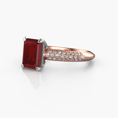 Der oben gezeigte Roségold Verlobungsring wird Morane EME genannt. Es ist ein Pavé Solitär Ring, da er einen zentralen Edelstein und ein Band mit Pavé-Fassung hat. Der einzigartige Pavé Solitär Verlobungsring ist in der Kombination 14 Karat Roségold mit Weißgold und ist mit einem smaragd schliff 8x6 mm Rubin-Mittelstein besetzt und das Band hat eine Pavé-Fassung mit Lab grown Diamant. Jedes Schmuckstück wird von unseren Meister-Goldschmieden in unserem eigenen Studio für Sie gefertigt. Um den zentralen Stein noch mehr zu betonen, hat das Band eine Pavé-Fassung mit weiteren Rubin. Durch die offenen Krappen kann das Licht aus mehreren Winkeln auf den Rubin treffen und der Rubin-Ring funkelt noch mehr. Das obere Foto zeigt die leidenschaftlich handgefertigten Details des Rings. Die hohe Positionierung der Mittelstein ist ein echter Blickfang. Der perfekte Verlobungsring für das Kronjuwel Ihres Lebens!Nach Erhalt Ihrer Bestellung beginnen unsere Goldschmiede mit Leidenschaft den kreativen Prozess und fertigen Ihren Verlobungsring in unserem eigenen Studio. Da wir keine großen Lager haben, werden diese Kosten nicht an Sie weitergegeben. Unsere Preisgestaltung ist der Beweis dafür! Wir bieten Schmuck zum niedrigsten Preis, garantiert.Unser Team fügt unserer Online-Kollektion täglich neue Designs hinzu. Unsere Designer und Goldschmiede arbeiten zusammen, um das beste Design zu kreieren. Wir bemühen uns, eine vielfältige Kollektion von Schmuckstücken anzubieten. Vielleicht haben Sie ein bestimmtes Design im Sinn. Eines, dass Sie irgendwo gesehen haben. Gerne geben wir Ihnen eine kostenlose Beratung. Wir machen Ihnen ein Angebot, basierend auf einem fairen Preis/Leistungsverhältnis, das Sie verblüffen wird.Um es einfacher zu machen, bieten wir eine kostenlose 30-tägige Rücksendung.