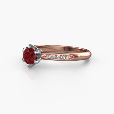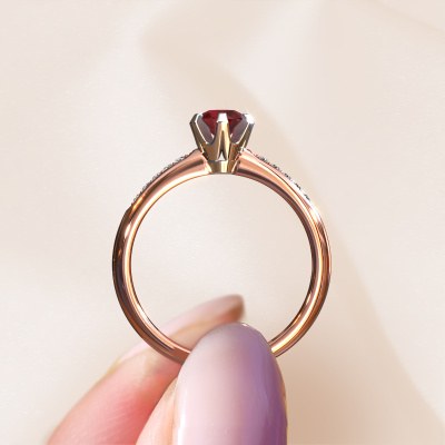 Der oben gezeigte Ring wird Tiffy 2 genannt. Es ist ein Pavé Solitär Ring, da er einen zentralen Edelstein und ein Band mit Pavé-Fassung hat. Dieser 14 Karat Roségold ring ist mit einem 4.7 mm rund Rubin-Mittelstein besetzt und das Band hat eine Pavé-Fassung mit Diamanten. Jedes Schmuckstück ist um Ihrem Finger Glanz zu verleihen. Jeder Ring wird von unseren Goldschmieden liebevoll von Hand gefertigt.Dieser traditionell Roségold Pavé Solitär Verlobungsring mit Pavé-Fassung hat einen exquisiten, rund Rubin als Mittelstein. Um den zentralen Stein noch mehr zu betonen, hat das Band eine Pavé-Fassung mit weiteren Diamanten. Durch die offenen Krappen kann das Licht aus mehreren Winkeln auf den Rubin treffen und der Rubin-Ring funkelt noch mehr. Das obere Foto zeigt die leidenschaftlich handgefertigten Details des Rings. Die hohe Positionierung der Mittelstein ist ein echter Blickfang. Der perfekte Verlobungsring für das Kronjuwel Ihres Lebens!Mit unserer modernen Technik können wir Schmuckstücke von höchster Qualität mit größter Sorgfalt für Sie entwerfen und anpassen. Unsere Verlobungsringe sind immer um 30 Prozent günstiger als bei anderen Juwelieren. Wir fertigen Verlobungsringe auf Bestellung, also müssen wir keine großen Lager unterhalten. Wenn Sie ein bestimmtes Budget haben, beraten wir Sie gerne entsprechend.Unsere Designer und Goldschmiede arbeiten jeden Tag zusammen und versuchen, neue Schmuckstücke zu kreieren. Vielleicht haben Sie irgendwo einen schönen, traditionell Verlobungsring gefunden, nach dem Ihr einzigartiger Ring gestaltet werden kann. Setzen Sie sich mit uns in Verbindung. Wir machen Ihnen ein Angebot, basierend auf einem fairen Preis/Leistungsverhältnis, das Sie begeistern wird.Um es einfacher zu machen, bieten wir eine kostenlose 30-tägige Rücksendung.