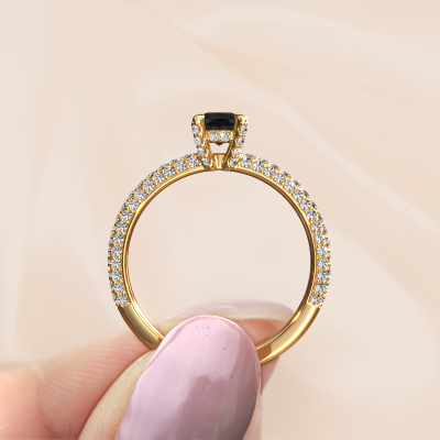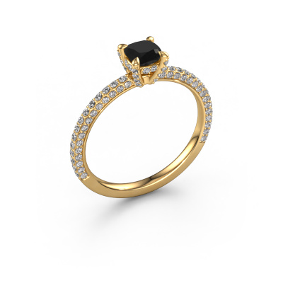 Der oben gezeigte Gold Verlobungsring wird Saskia 2 cus genannt. Es ist ein Pavé Solitär Ring, da er einen zentralen Edelstein und ein Band mit Pavé-Fassung hat. Der moderne Pavé Solitär Verlobungsring ist in der Kombination 14 Karat Gold mit Gold und ist mit einem cussion 0.54 crt Schwarz Diamant-Mittelstein besetzt und das Band hat eine Pavé-Fassung mit Lab grown Diamant. Jedes Schmuckstück wird nur für Sie persönlich hergestellt, mit Liebe zum Detail und Design. Um den zentralen Stein noch mehr zu betonen, hat das Band eine Pavé-Fassung mit weiteren Schwarz Diamant. Durch die offenen Krappen kann das Licht aus mehreren Winkeln auf den Schwarz Diamant treffen und der Schwarz Diamant-Ring funkelt noch mehr. Das obere Foto zeigt die leidenschaftlich handgefertigten Details des Rings. Die hohe Positionierung der Mittelstein ist ein echter Blickfang. Der perfekte Verlobungsring für das Kronjuwel Ihres Lebens!Haben Sie ein bestimmtes Budget? Sie können uns gerne kontaktieren, damit wir Ihre Optionen besprechen können. Wir bieten unsere Verlobungsringe zum garantiert besten Preis, denn wir fertigen sie auf Bestellung. Solche Preise finden Sie nirgendwo anders!Unsere Designer und Goldschmiede arbeiten jeden Tag zusammen und versuchen, neue Schmuckstücke zu kreieren. Vielleicht haben Sie irgendwo einen schönen, moderne Verlobungsring gefunden, nach dem Ihr einzigartiger Ring gestaltet werden kann. Setzen Sie sich mit uns in Verbindung. Wir machen Ihnen ein Angebot, basierend auf einem fairen Preis/Leistungsverhältnis, das Sie begeistern wird.Um es einfacher zu machen, bieten wir eine kostenlose 30-tägige Rücksendung.